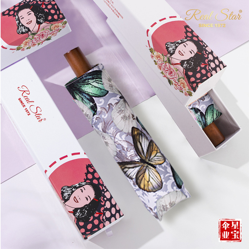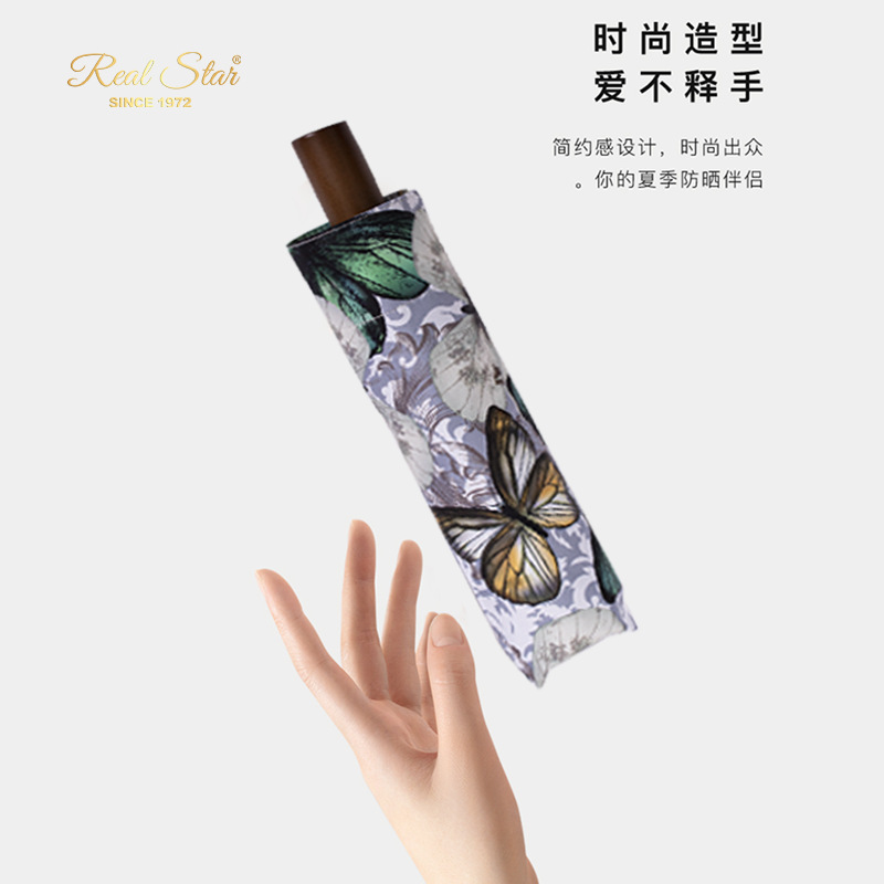 26星宝RST新款女士三折伞手动打开满版蝴蝶数码印雨伞黑胶防晒