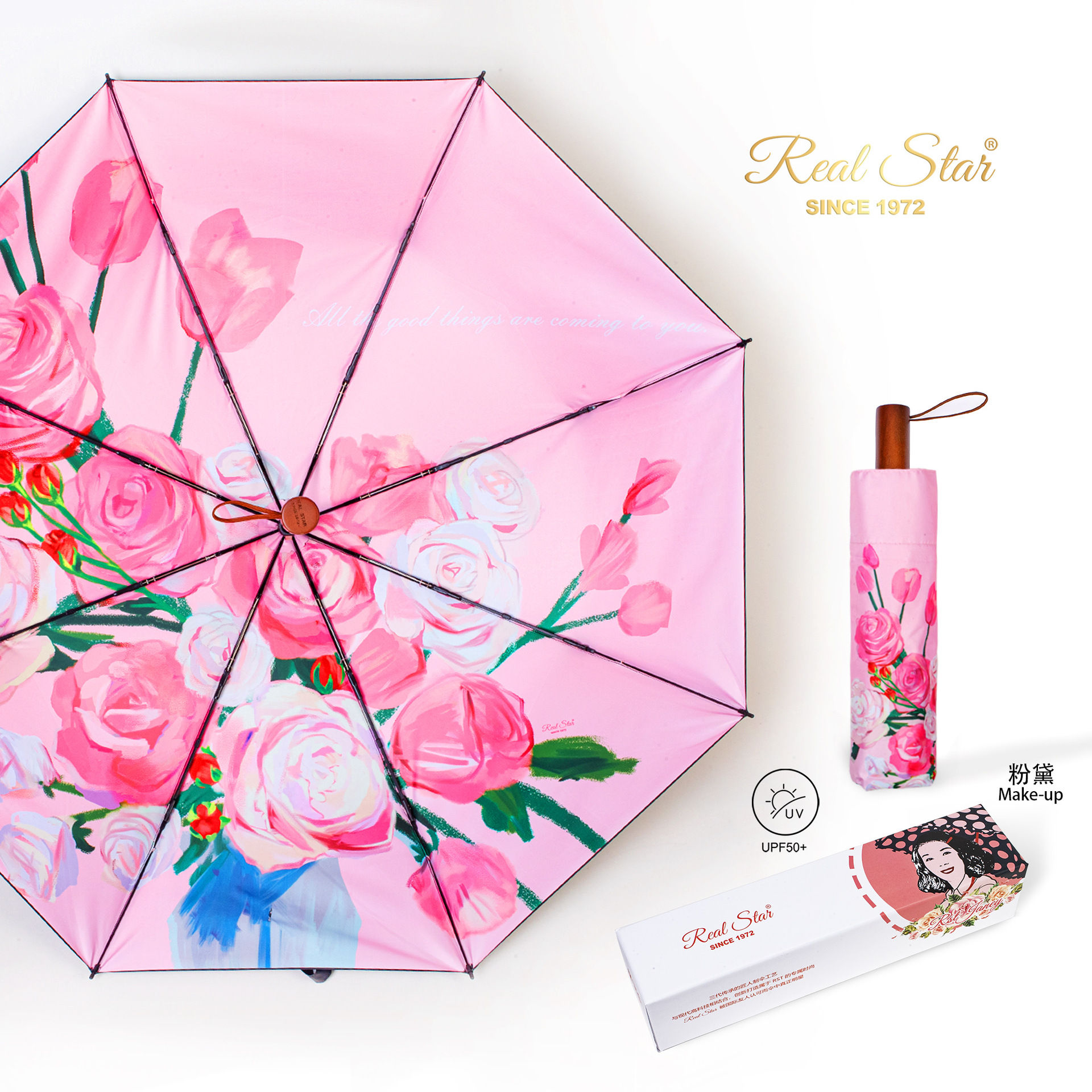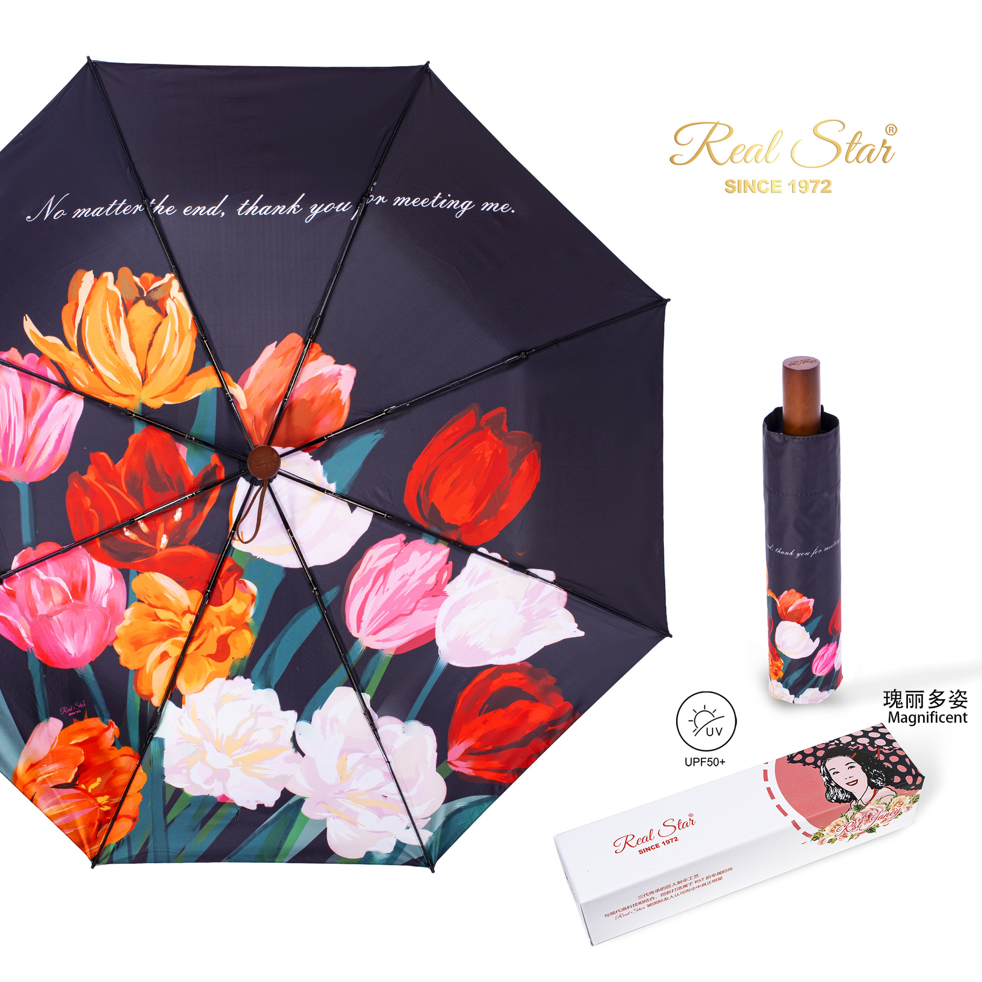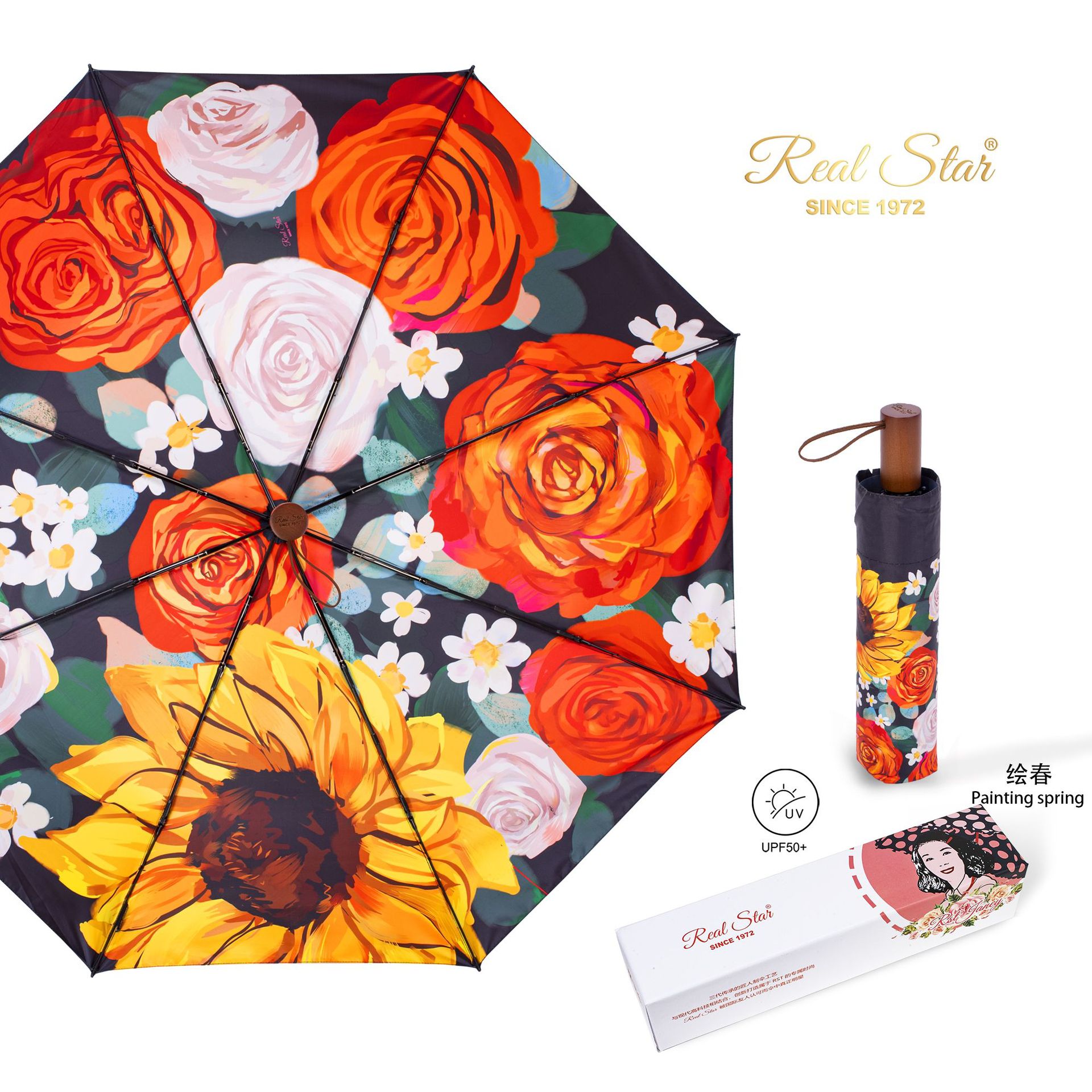 26星宝RST新款女士三折伞手动打开满版蝴蝶数码印雨伞黑胶防晒 English | 投诉