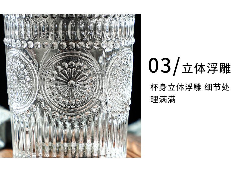 复古浮雕金边玻璃杯太阳花水杯 法式冷饮杯奶茶店