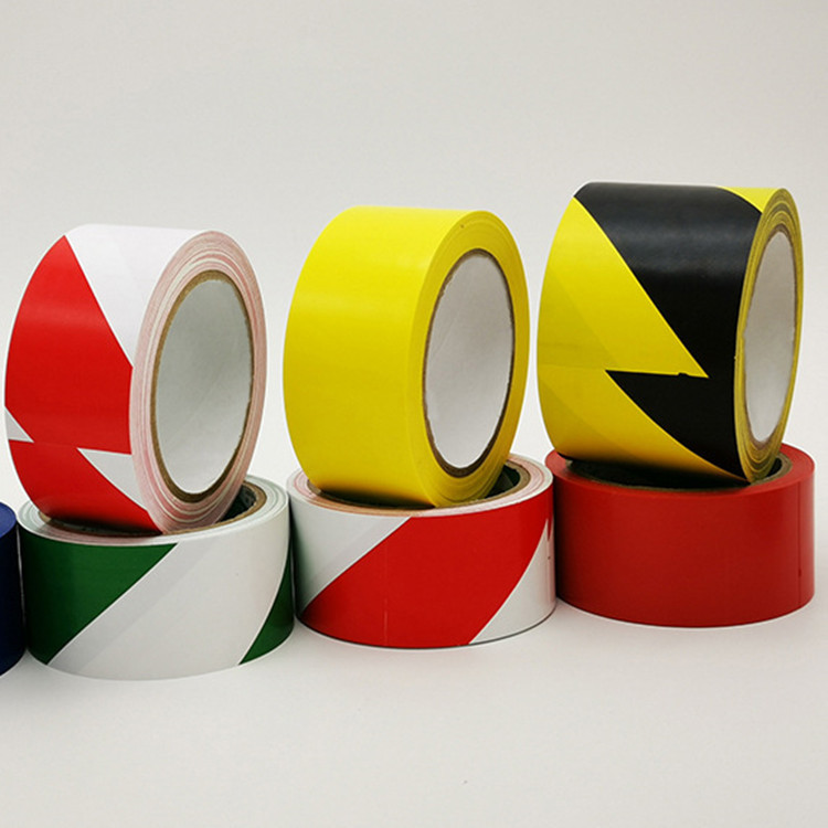 材质:地板胶带是以聚氯乙烯(PVC)薄膜为基材,使用橡胶型压敏胶制造而成。有黑黄相间,红白相间,绿白相间,纯黄,纯红,纯绿,绿黑等不同颜色搭配