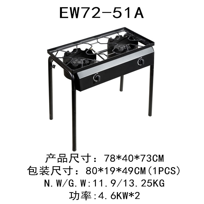 压电式点火,无需额外准备点火器。 双炉头设计,整体功率达到36000BTU,可同时进行烹饪,节省烹饪时间。 产品的高度设计合理、便于操作,带来舒适的烹饪体验。 风门片可调节,保证拥有安全的蓝色火焰。 弯脚设计,炉体结构坚固、不易脱焊。承重力好,适用于多种型号的厨具。 周边产品众多,满足不同的烹饪需求。 脚管可拆卸,易安装,堵头有效防止尘土进入,适用于户外烹饪场合。 。