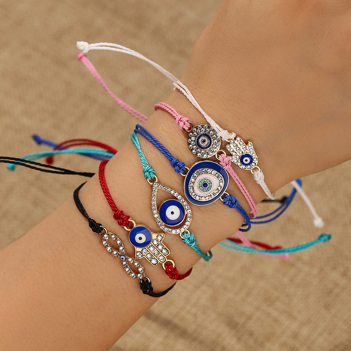 2023合金吊坠编织手绳智慧之眼多层手串创意恶魔之眼手掌手链批发 投诉