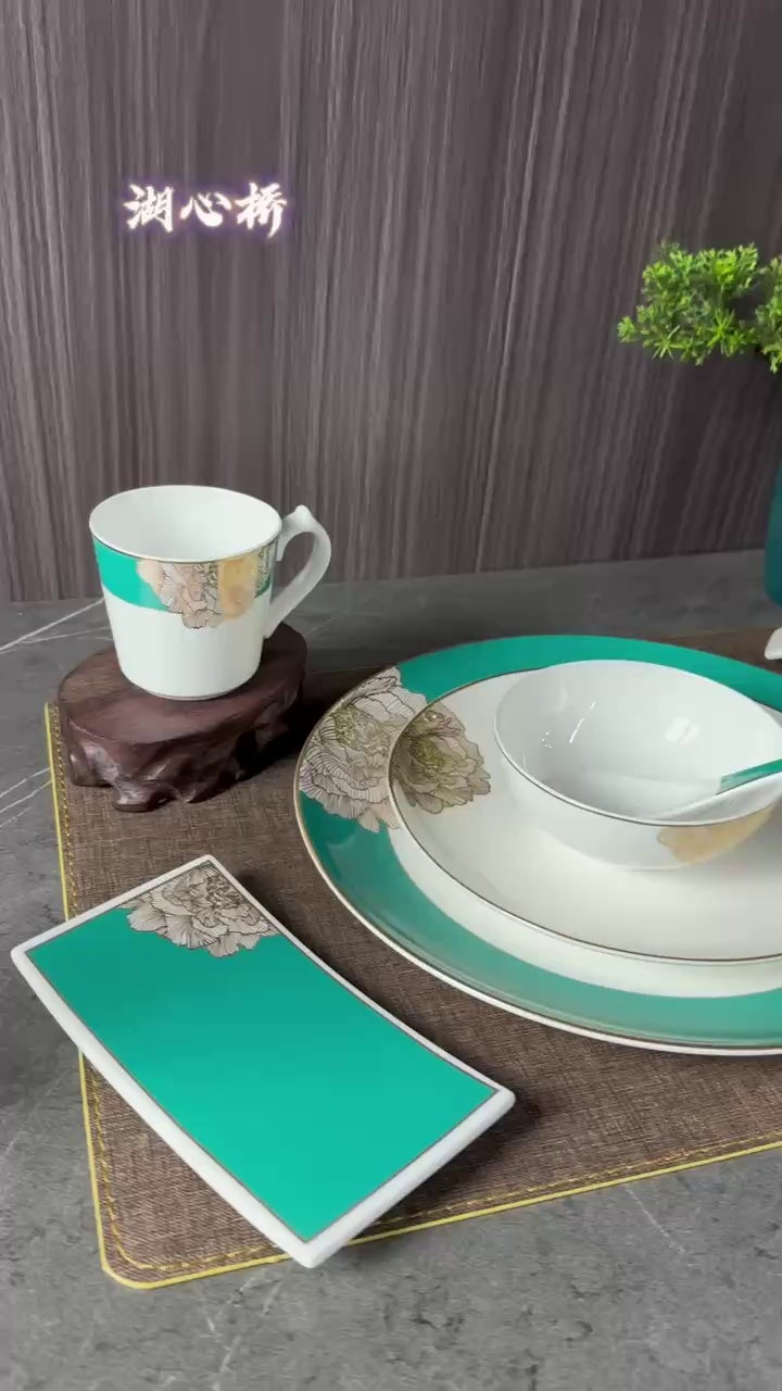 奢华金牡丹系列高端陶瓷套装,金边钩花镶边设计,搭配宝石绿色调,尽显国风富贵奢华之美,帮助提升餐桌格调与用餐体验。