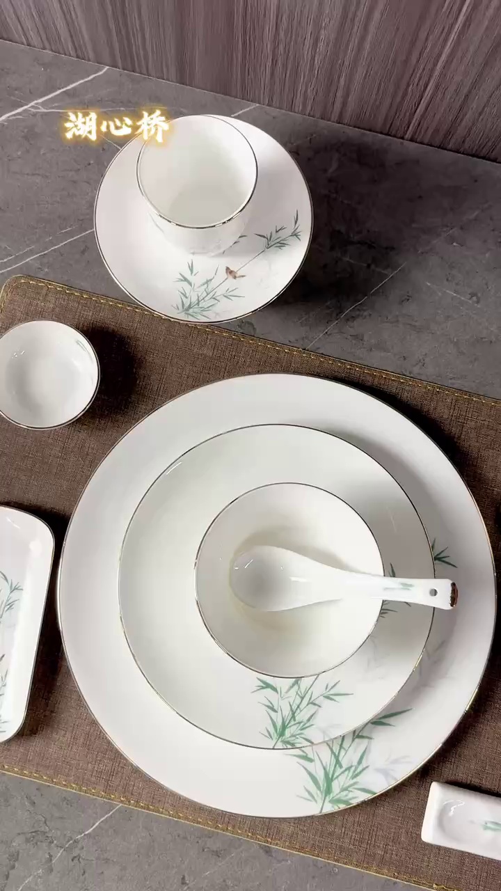 “窗外捎溪”系列陶瓷餐具套装,把中式古典园林建筑美学与温润平滑的骨瓷材质相结合,塑造中式餐桌美学新概念。贴花工艺搭配金边勾勒,增加就餐体验与档次不在话下!