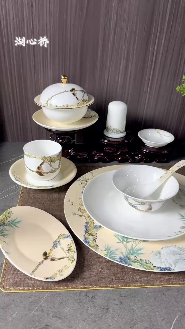 复古花鸟系列陶瓷餐具套装,精致烧花工艺,浮雕感水墨花鸟画图案,展现中式宫廷风之美。