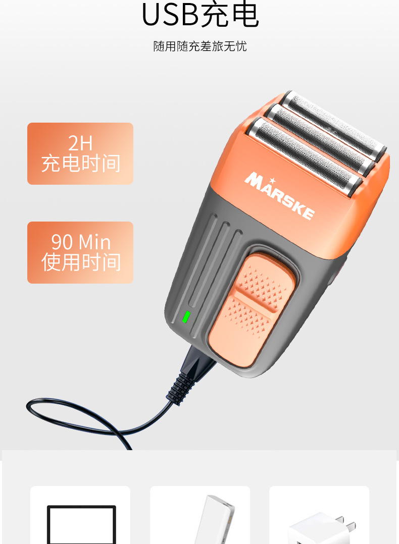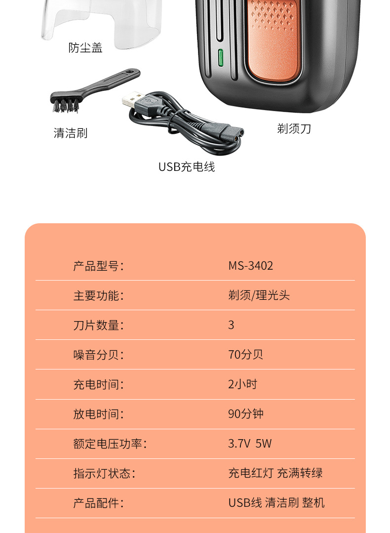 套装内含:剃须刀一个, 充电线,小刷子,英文说明书