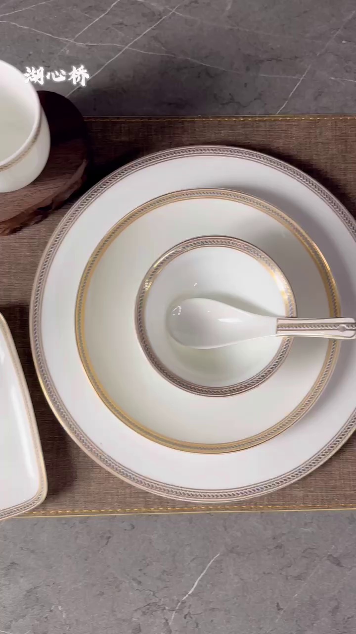 金色国度系列陶瓷餐具套装,采用高骨粉含量骨瓷制作,以经典白色为底色,搭配金色纹理图案镶边,塑造奢华的宫廷风质感。