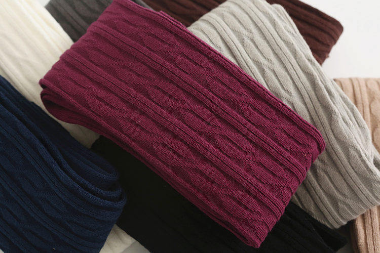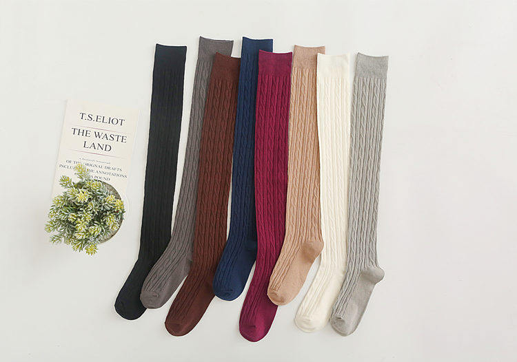 跨境热销经典麻花编织过膝袜(有纯色版和双杠款),双针工艺,厚度适中,袜筒长55公分左右,单双克重85克上下,每双都独立包装,供货稳定,欢迎垂询!