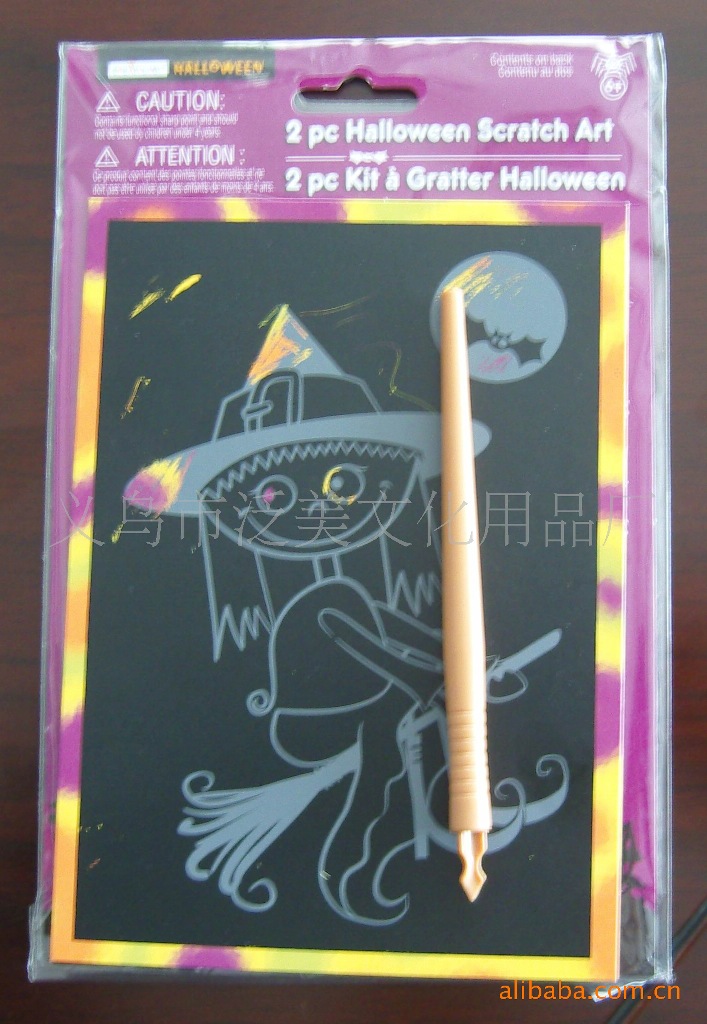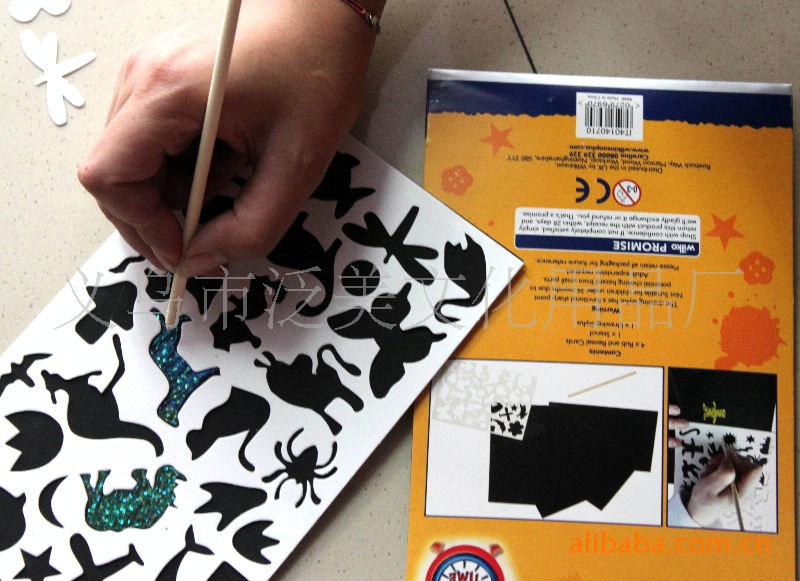 刮刀是条小竹棍,有锋利的刀口,但是不刮手!---是竹子的,当然不刮手。通过镂空的模板中的卡通图,刮几下,就轻松去除黑墨,显示出五彩斑斓的卡通图了!!!