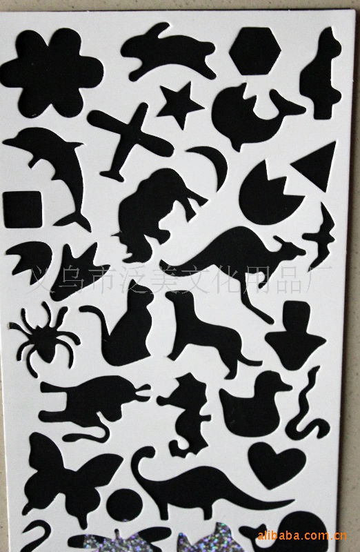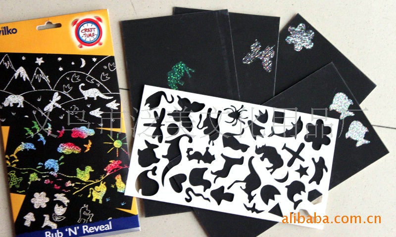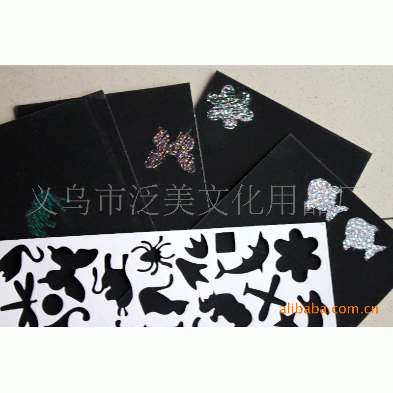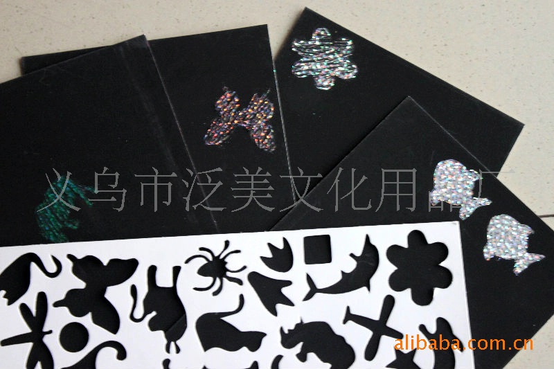 在金色,银色,镭色的特种纸上油印黑色油墨;用竹质刮刀按卡通图案的轮廓刮,就显示出色彩斑斓的金色,银色,镭色底纹;