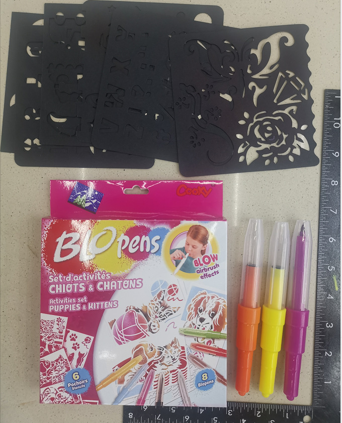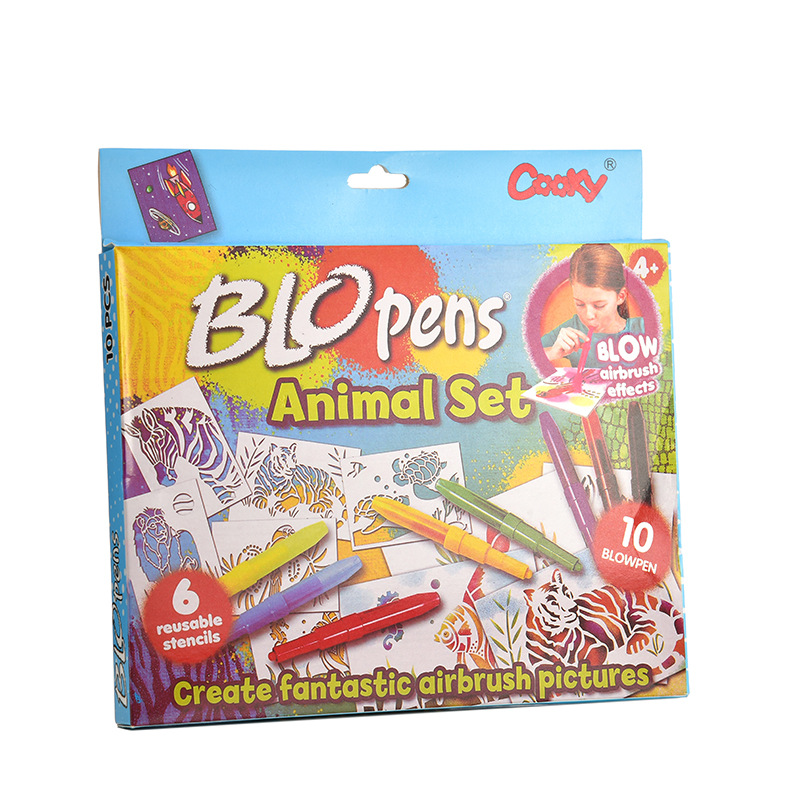 纤维笔头具备蓬松的透气性。 吹笔,就是通过空气的气压导向笔头,让气压将水彩笔的墨水从液态变成气雾从导气孔喷出,喷雾吹向“挖空”的纸卡,移去纸卡,纸面上就留有“挖空”卡通图。
