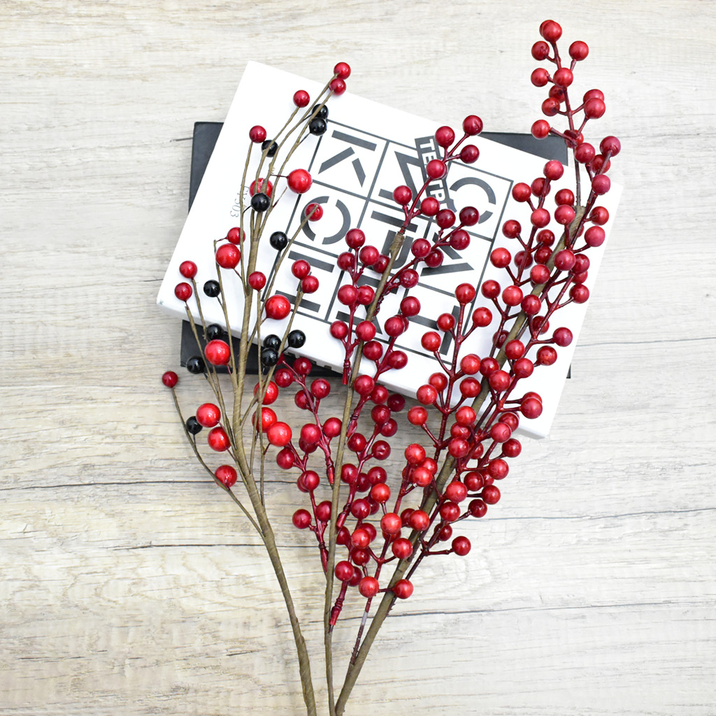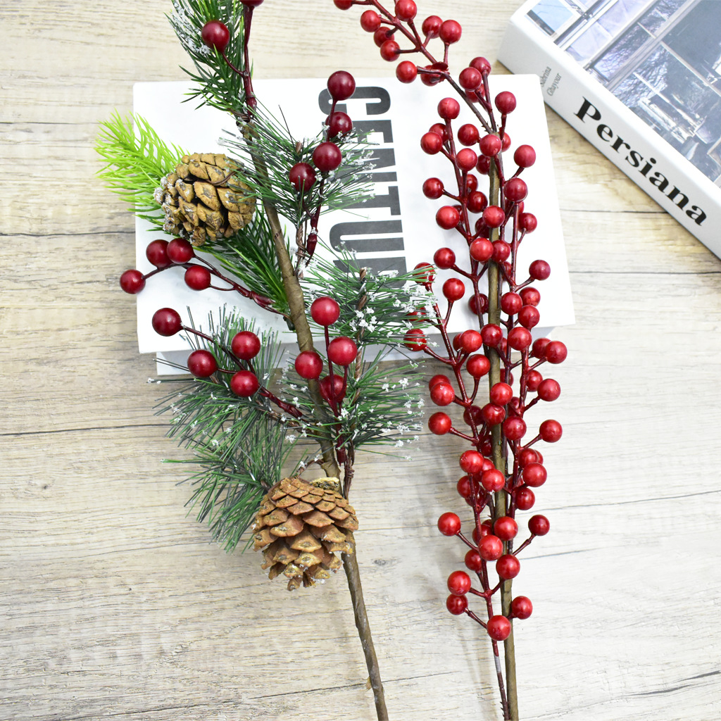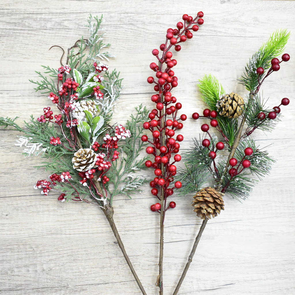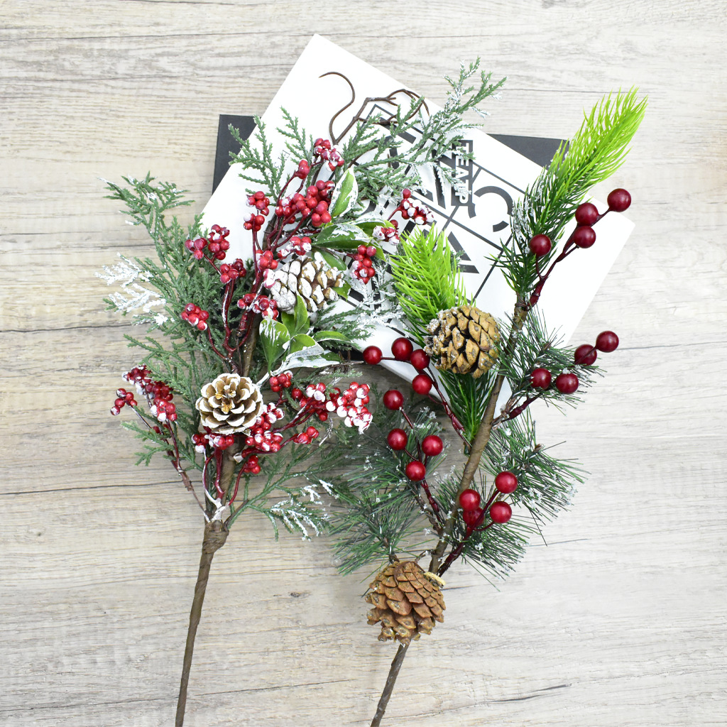品名:圣诞插枝 材质:PVC、泡沫、铁丝、松果、纸