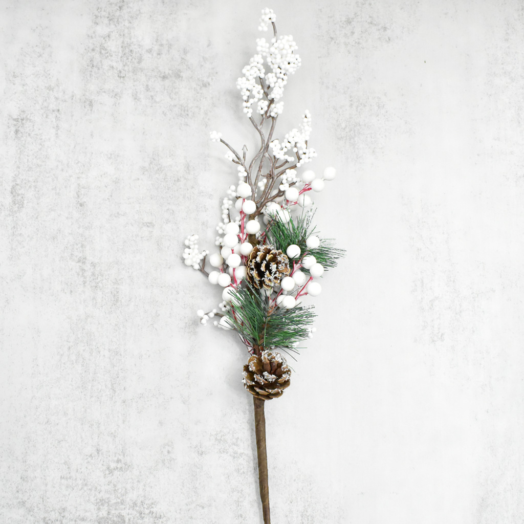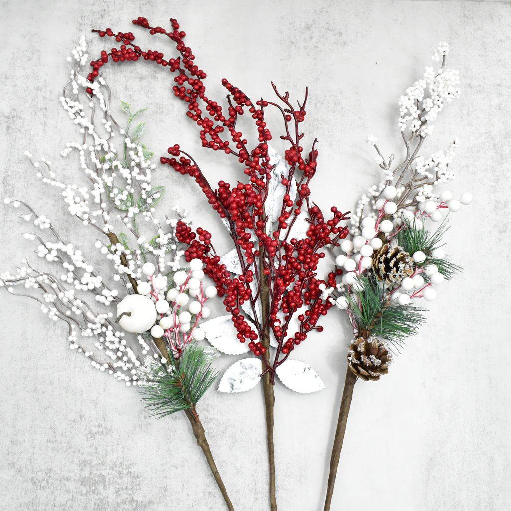 品名:圣诞插枝 材质:PVC、泡沫、铁丝、松果、纸