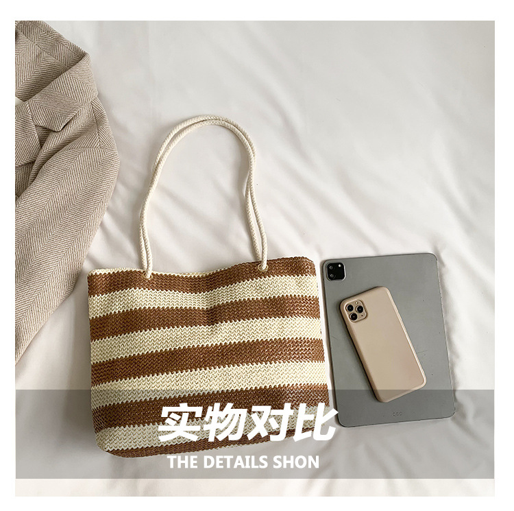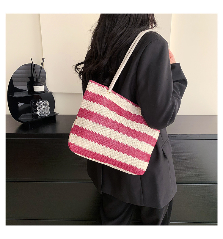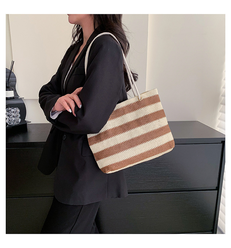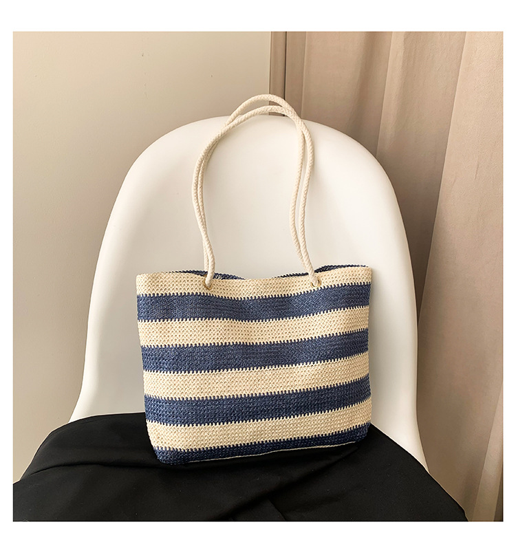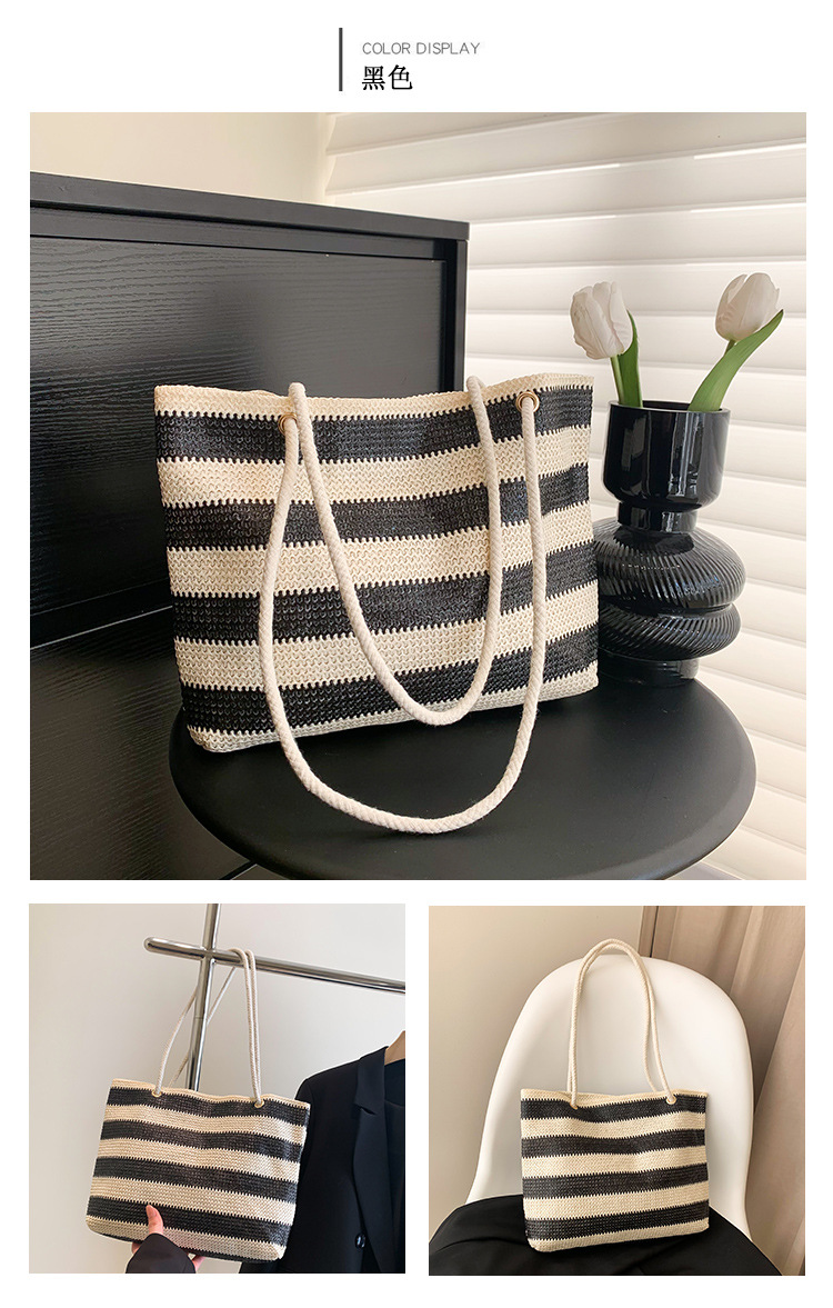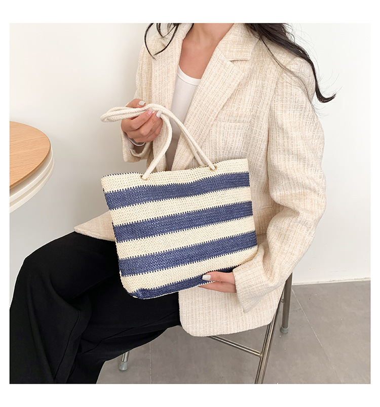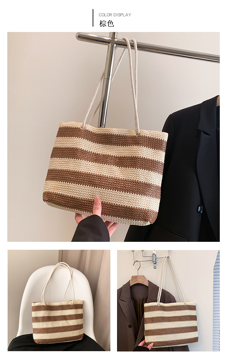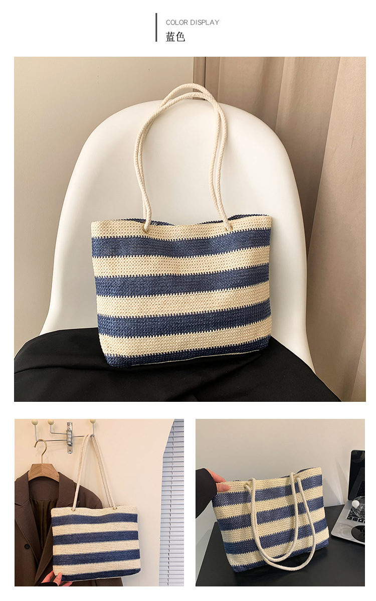 2023女士单肩包大容量简约手提购物袋时尚洋气编织条纹沙滩休闲包