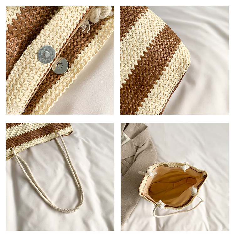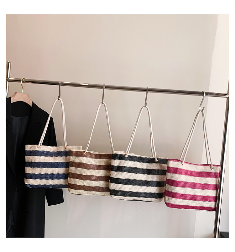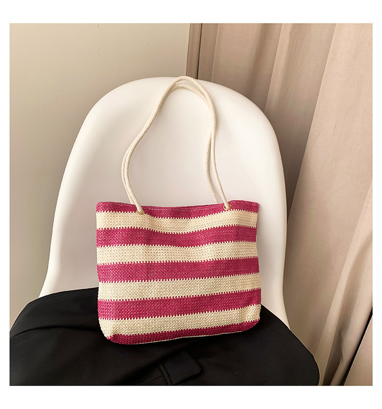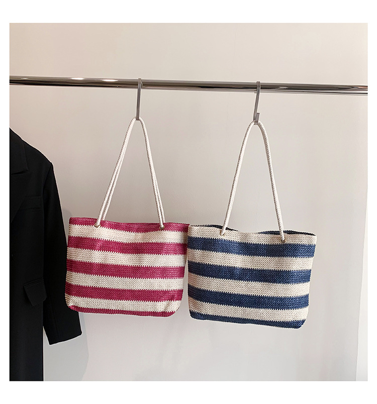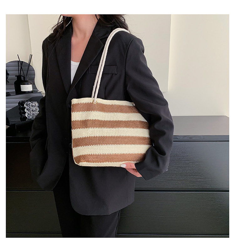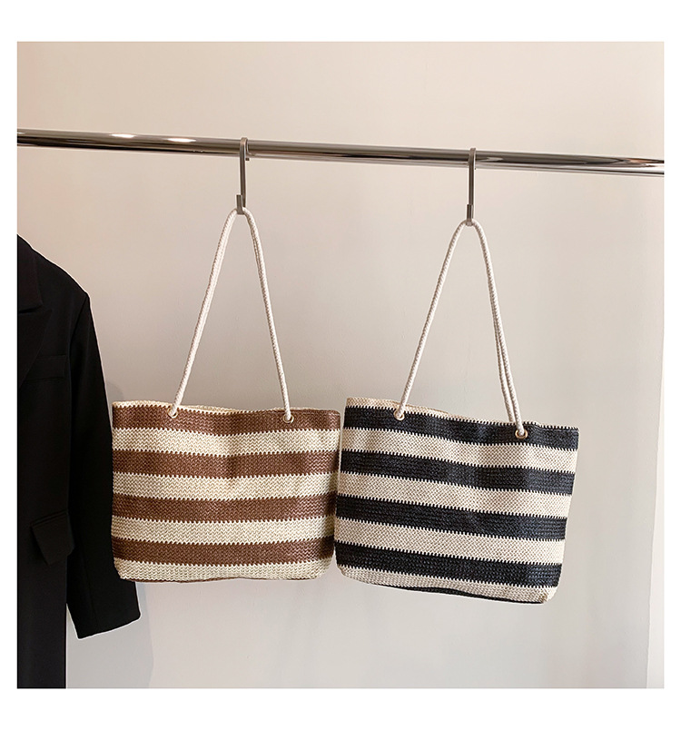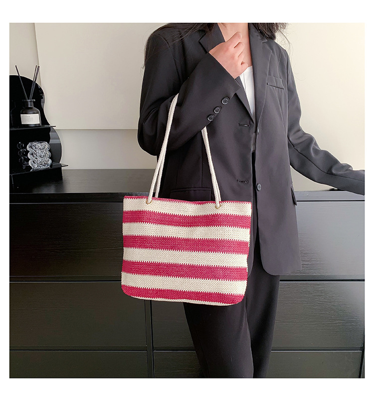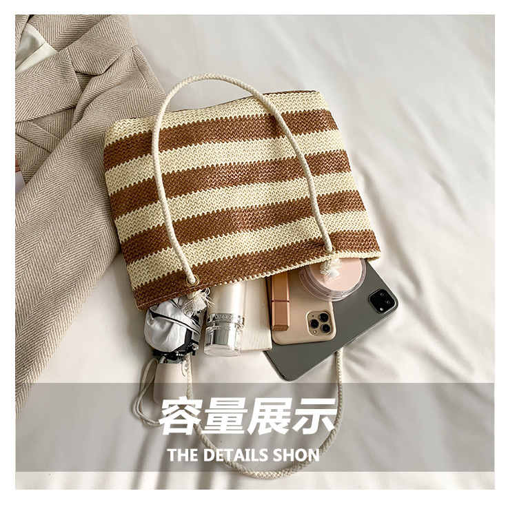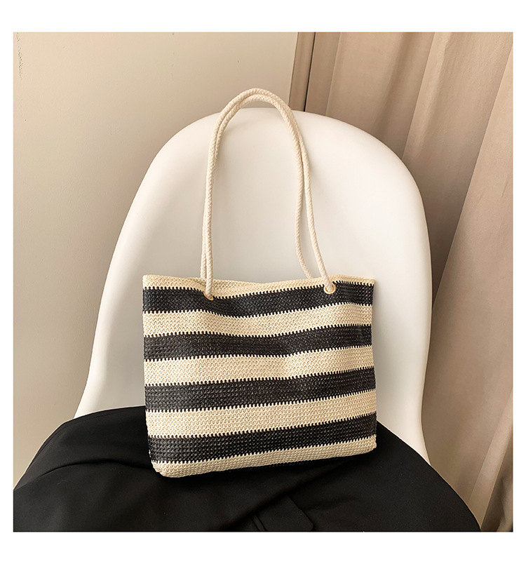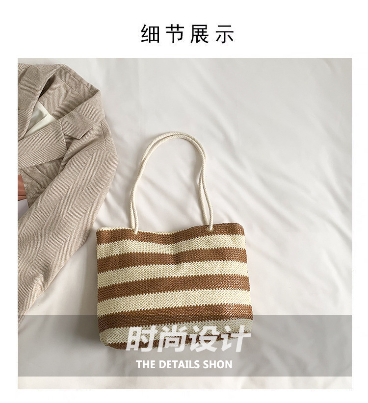 2023女士单肩包大容量简约手提购物袋时尚洋气编织条纹沙滩休闲包
