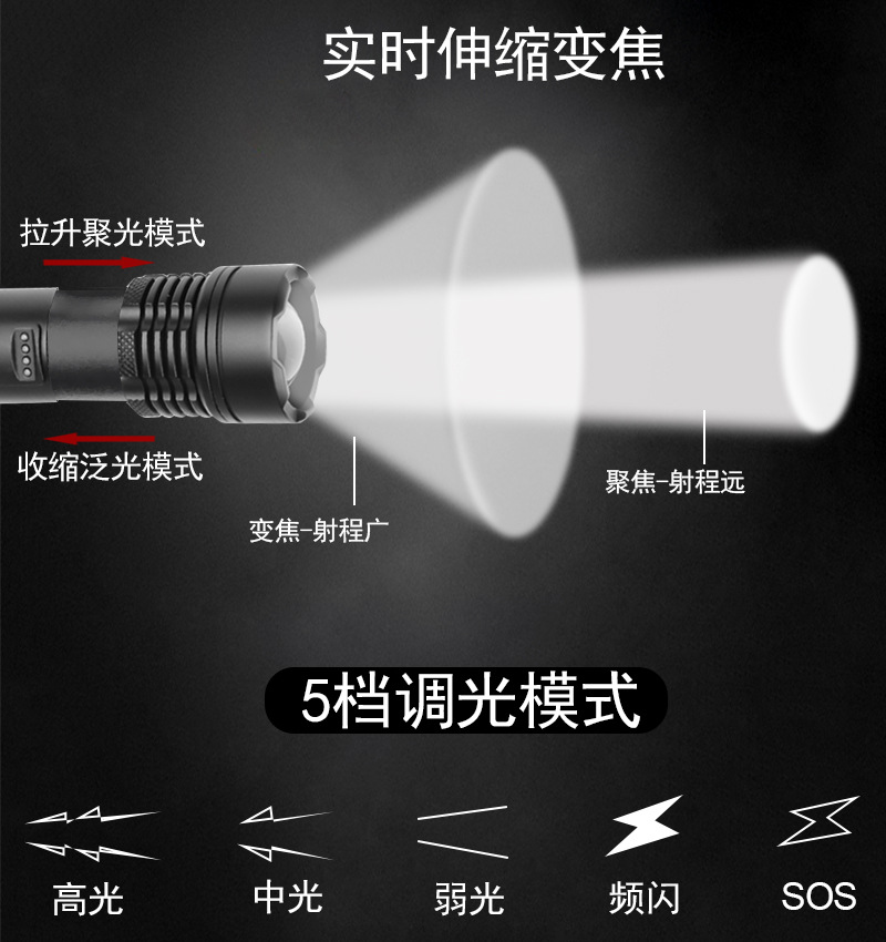 2. 4核P50 高功率灯芯,暴力强光,旋转调焦,远近照明兼顾。