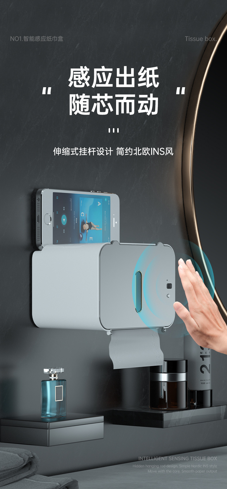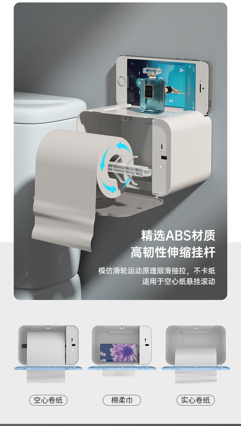 2023新款壁挂式智能感应自动出纸机卫生间免打孔抽纸盒厕所纸巾盒 English | 投诉