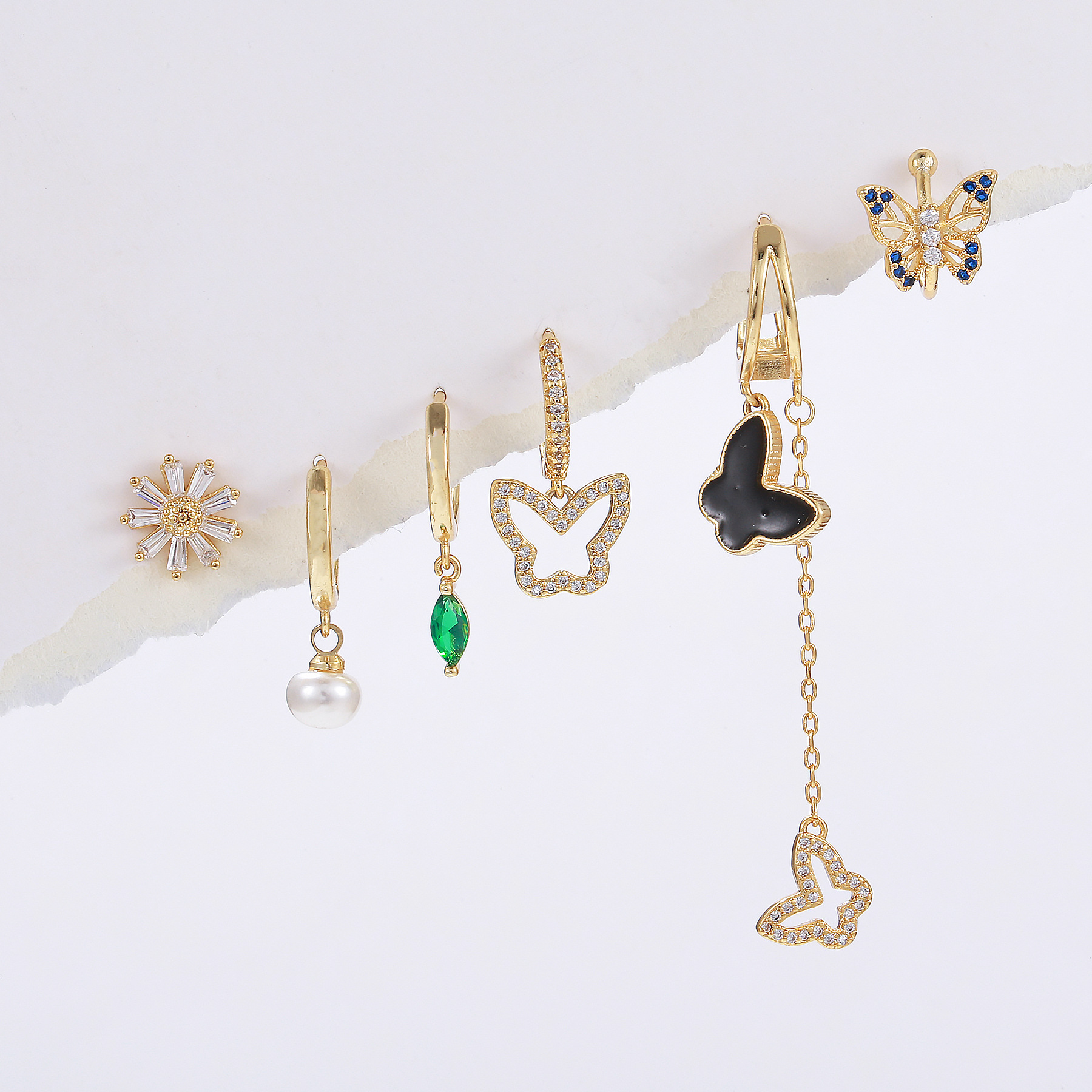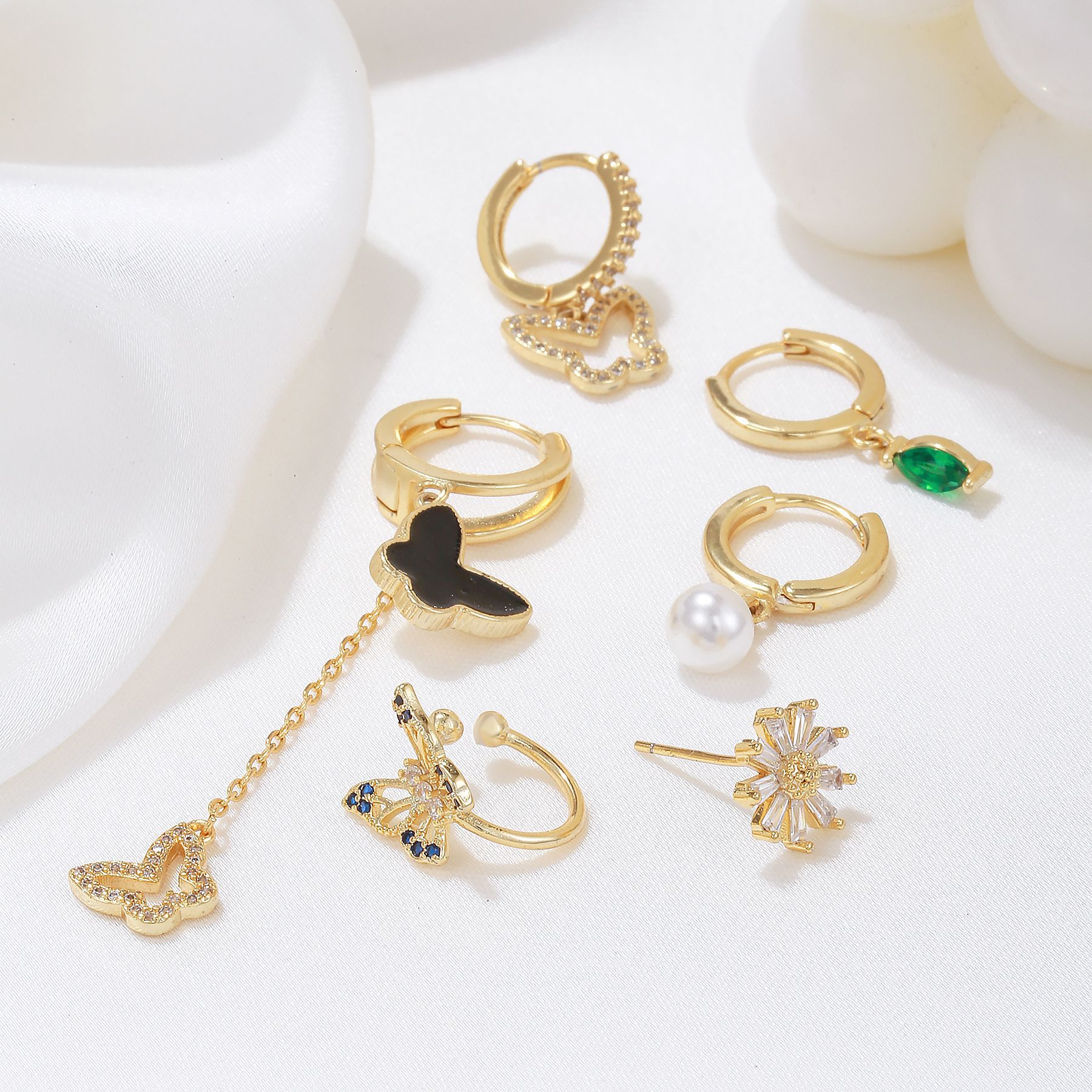 时尚森系花朵蝴蝶耳环 创意设计长款流苏珍珠吊坠耳扣六件套耳饰 English | 投诉
