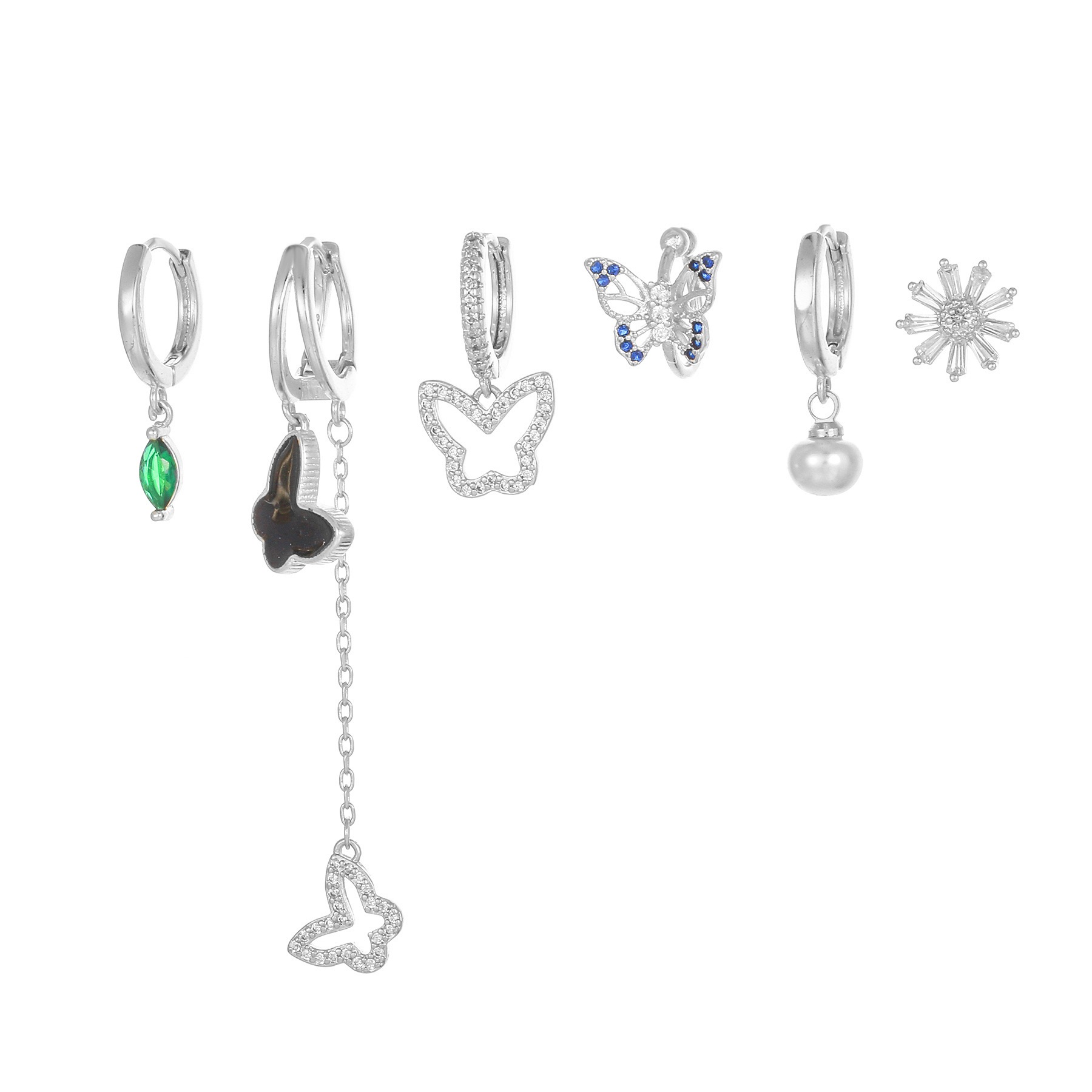 时尚森系花朵蝴蝶耳环 创意设计长款流苏珍珠吊坠耳扣六件套耳饰