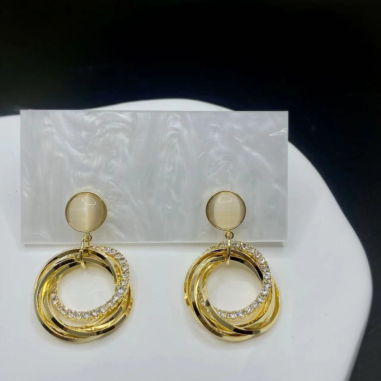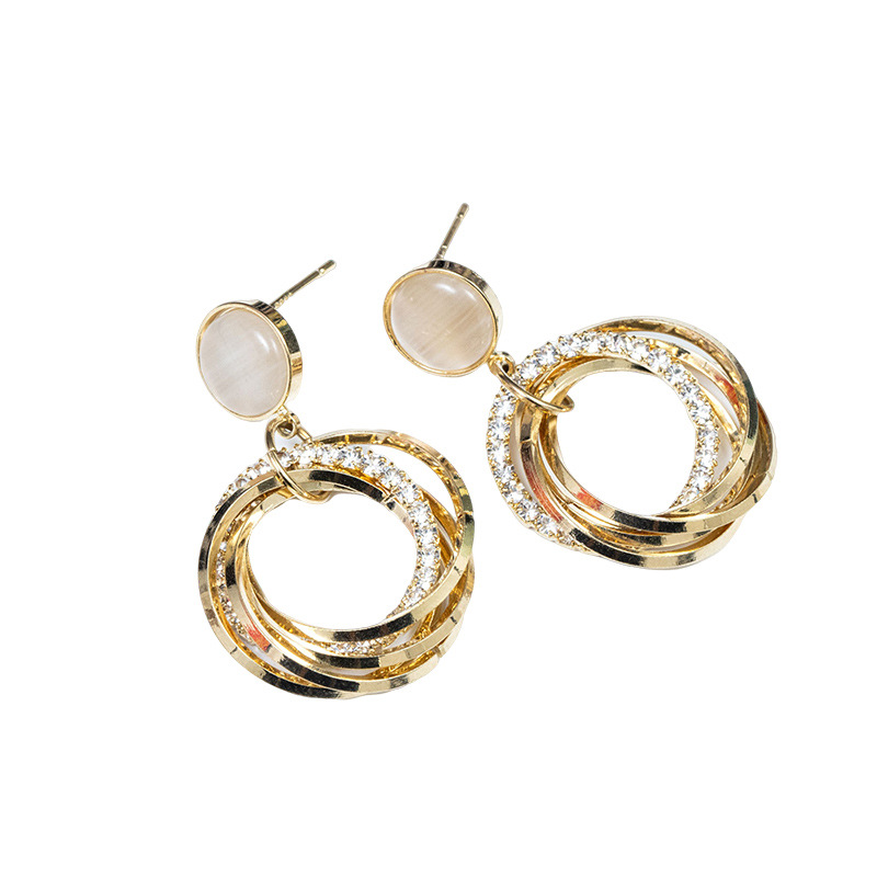 气质几何耳坠法式OL多圈个性猫眼石圈圈耳环 (真金电镀)