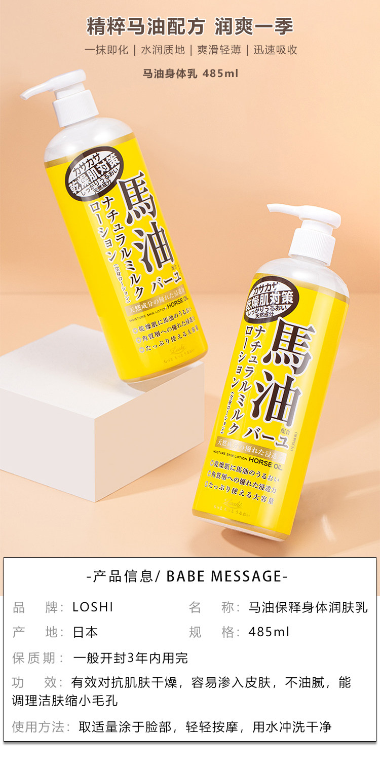 日本北海道loshi马油身体乳润肤露大瓶去鸡皮保湿补水秋冬季 女