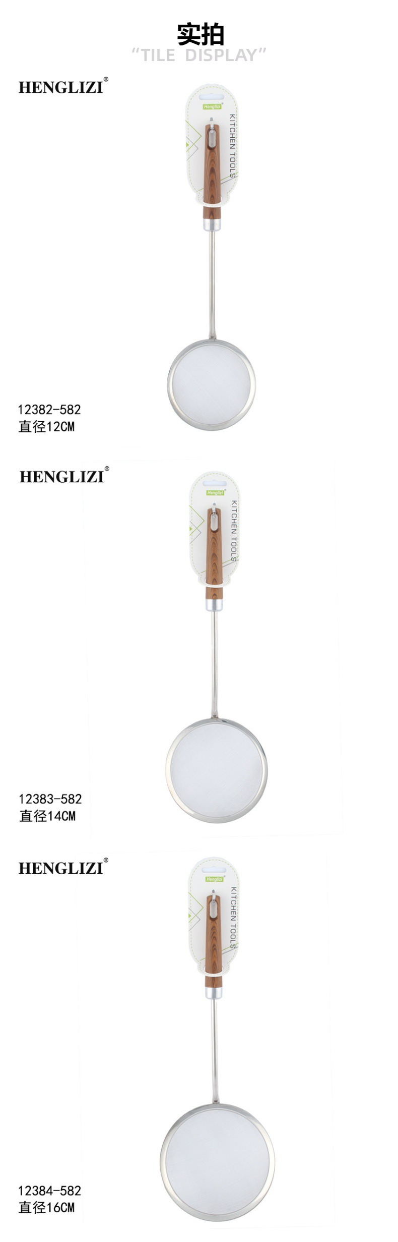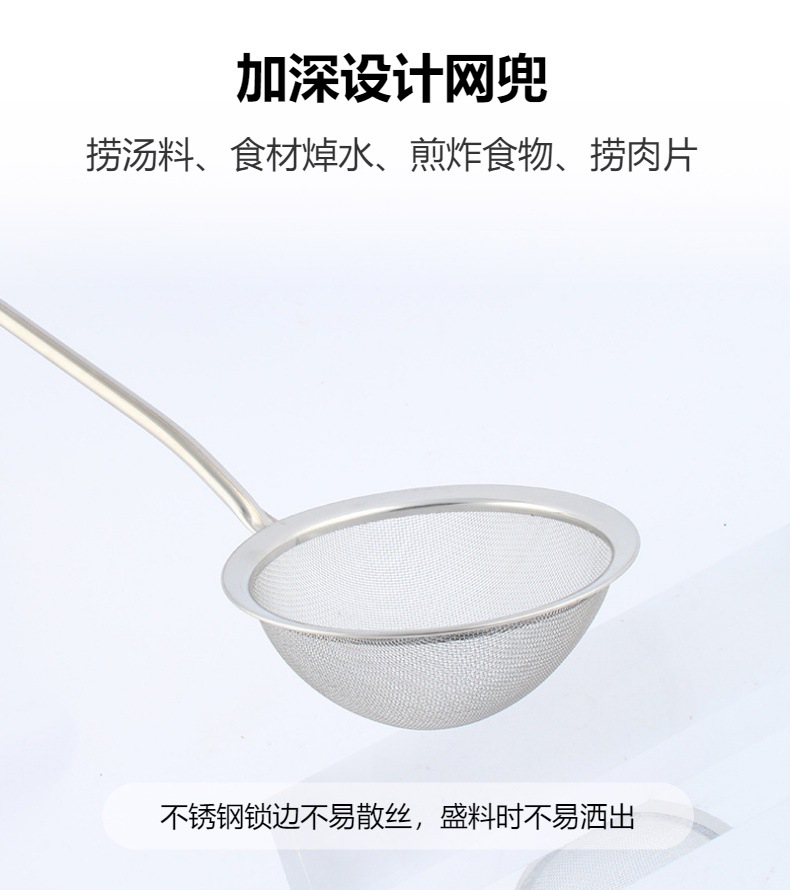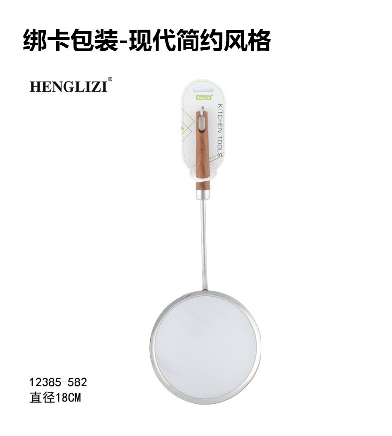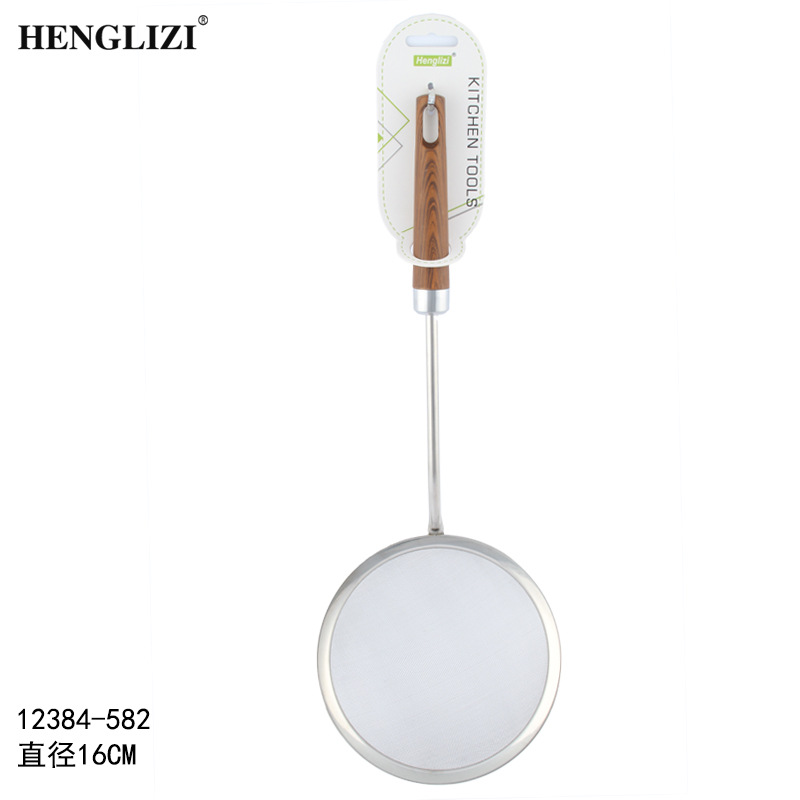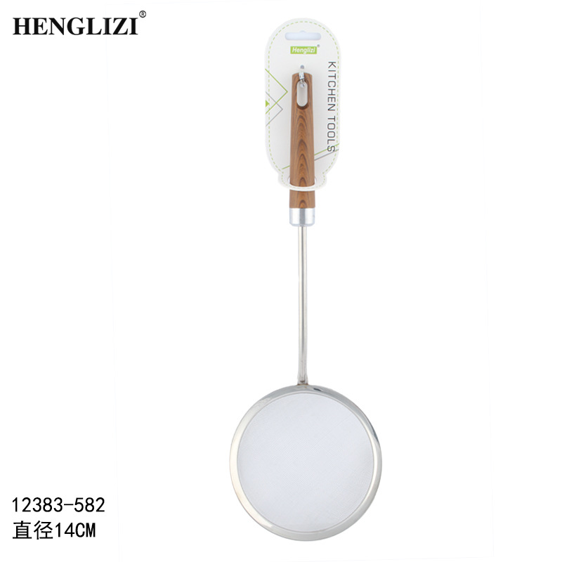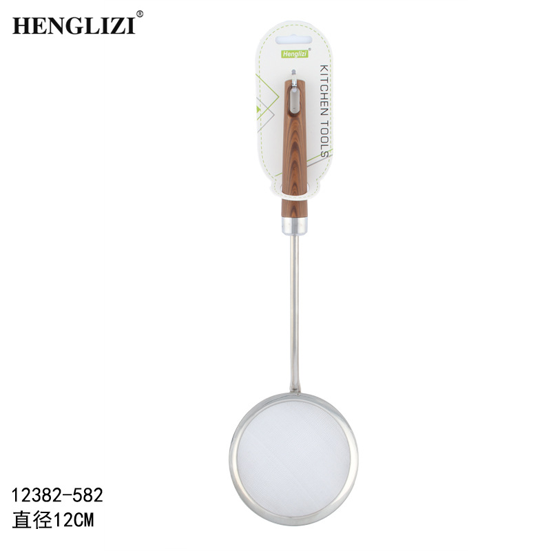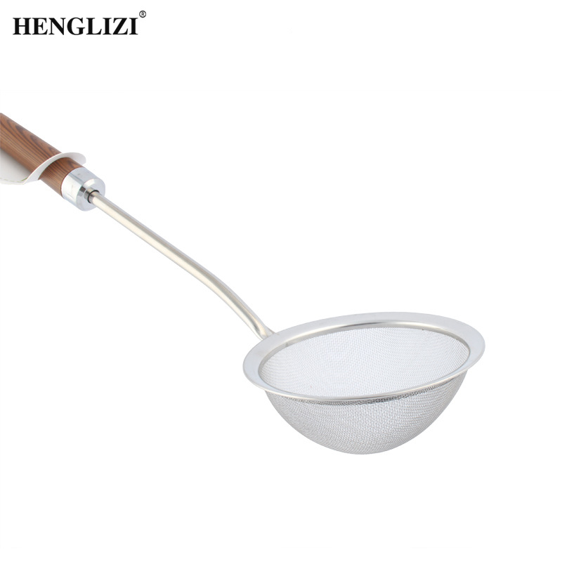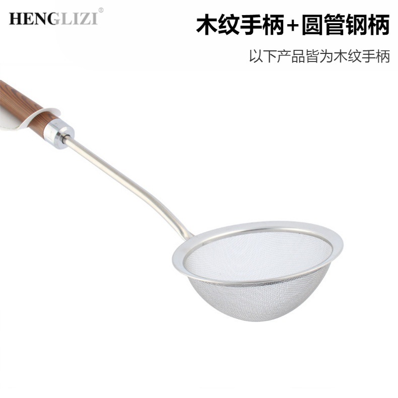 跨境不锈钢厨房用具过滤油渣勺打沫勺木纹手柄家用过滤网漏勺油格