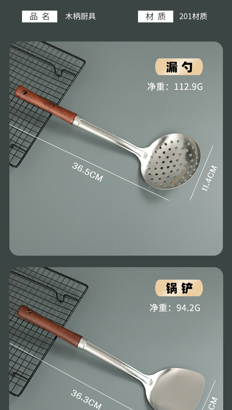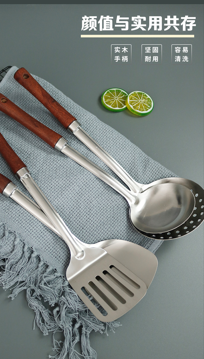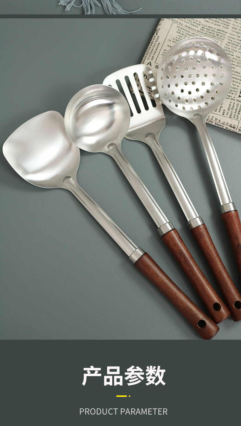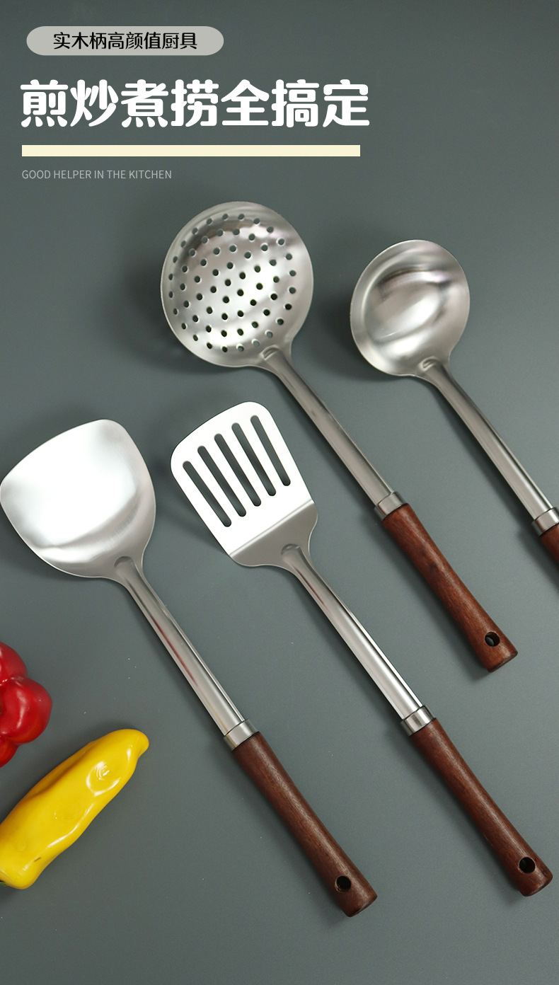 不锈钢木柄汤勺厨房用品厨具炒铲加厚防烫炒菜铲子锅铲勺子套装 English | 投诉