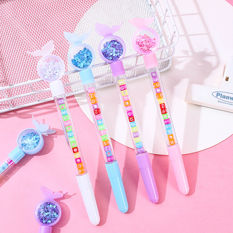 创意韩版蝴蝶串珠流沙仙女棒高颜值亮片中性笔礼品笔黑色签字笔