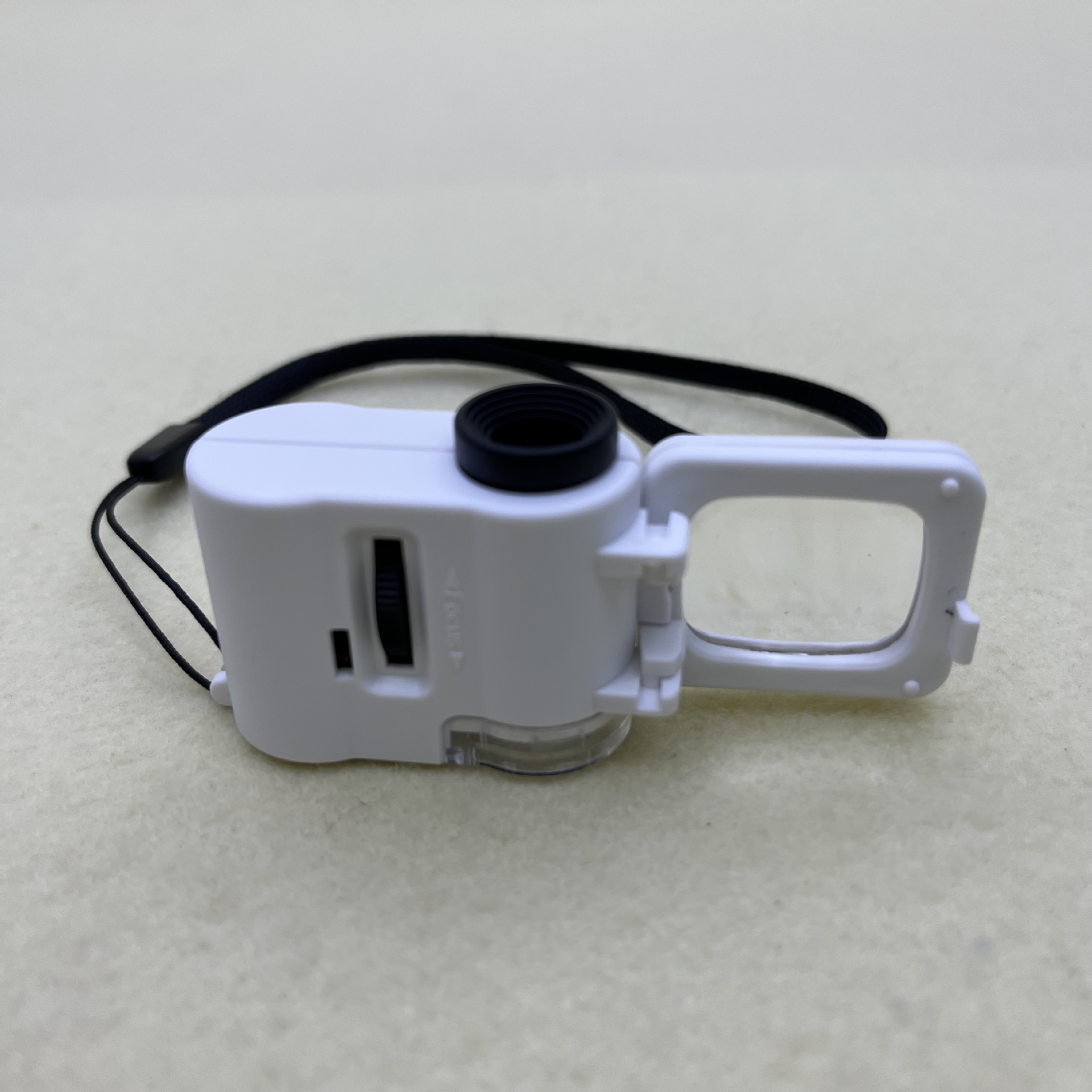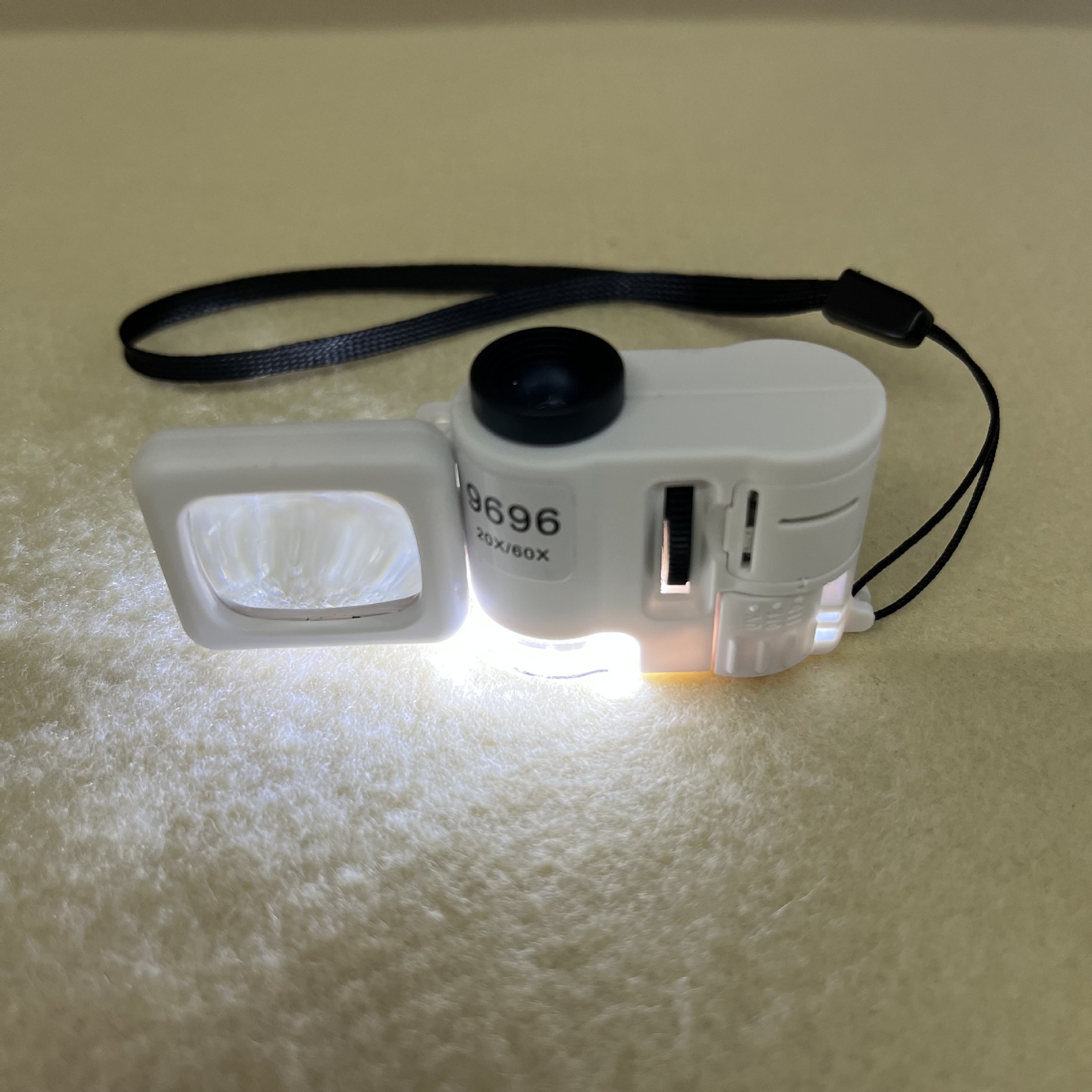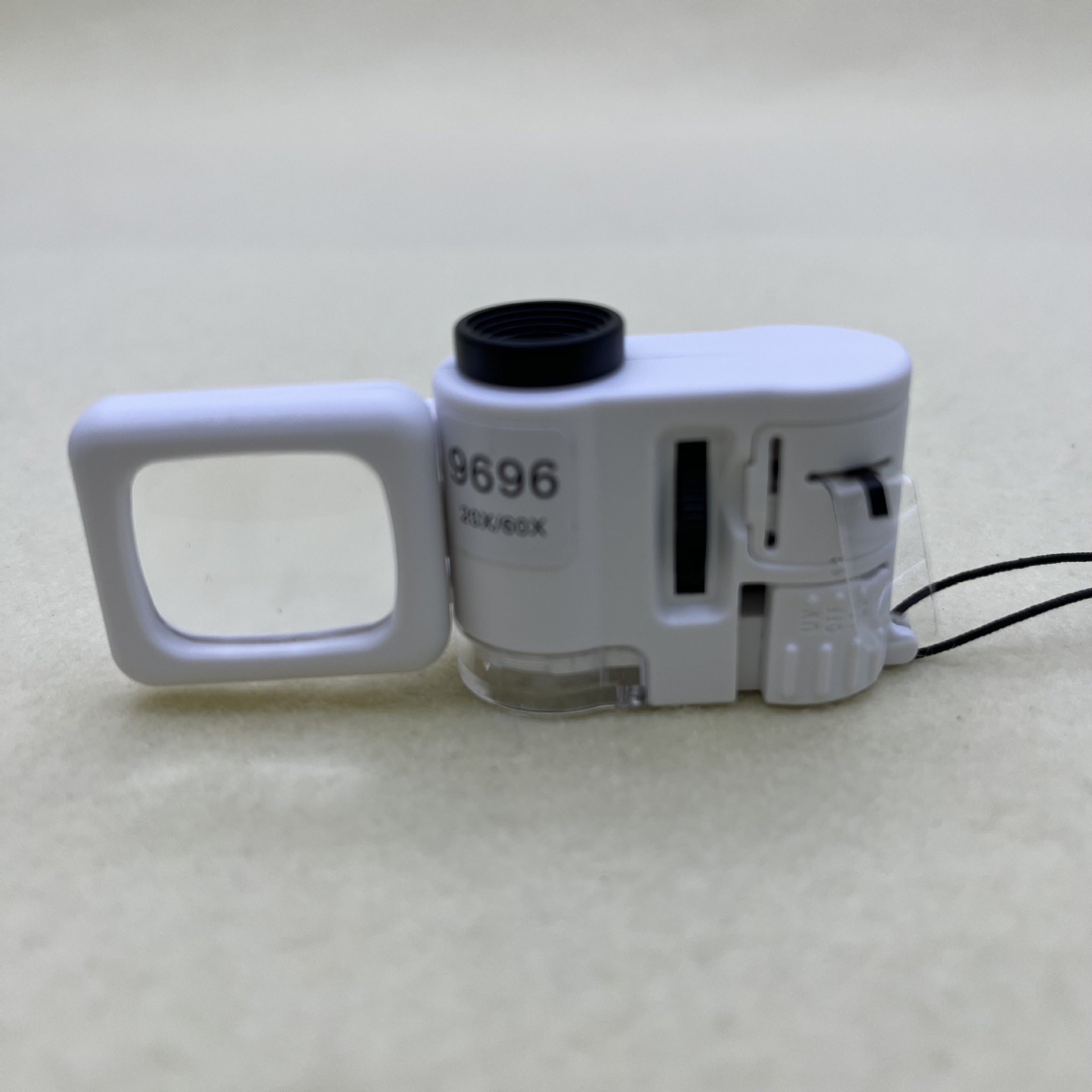 产品描述:长方形镜片尺寸22×18mm,20倍,可调焦距,自带光源照明,放大倍数60倍,观测清晰,配有紫灯,用于识别纸币真伪,开关新颖,与产品本身一体式设计,附带可翻转的长方形放大镜,不用时可收起,减少产品面积,含3枚LR1130纽扣电池(出厂含)该产品适用于珠宝鉴定、邮票钱币、印刷业、电路板等用途。