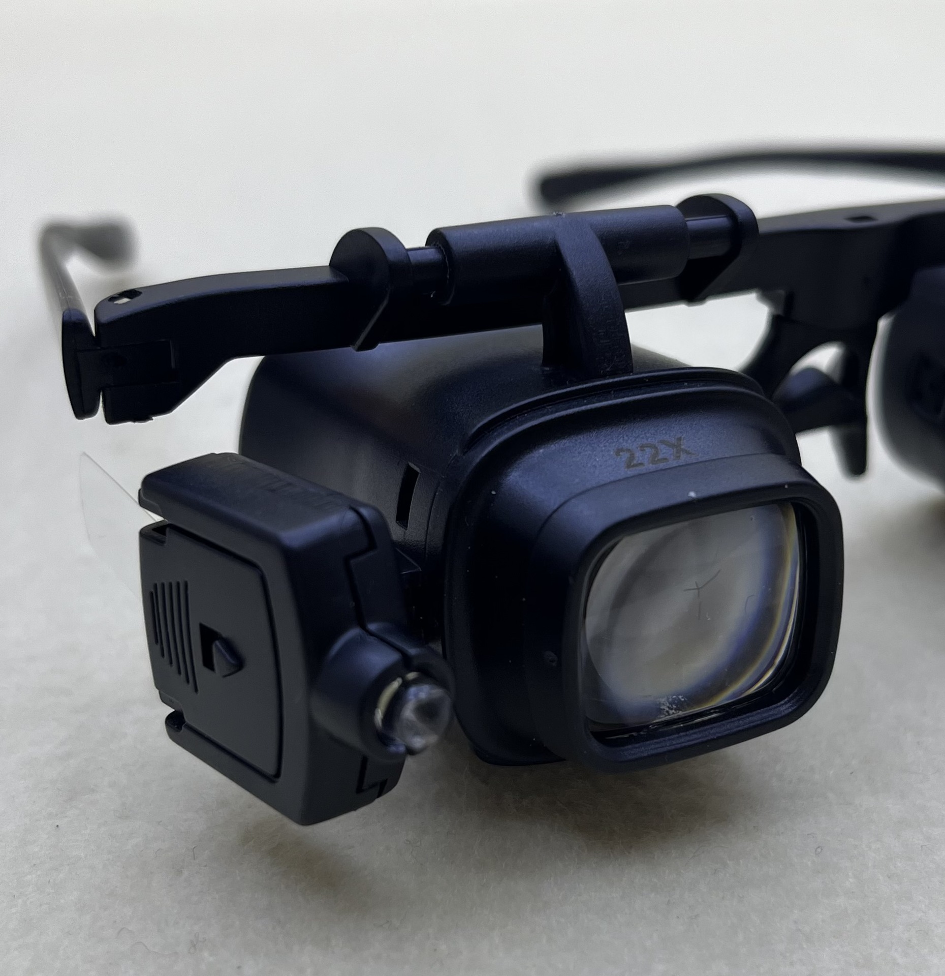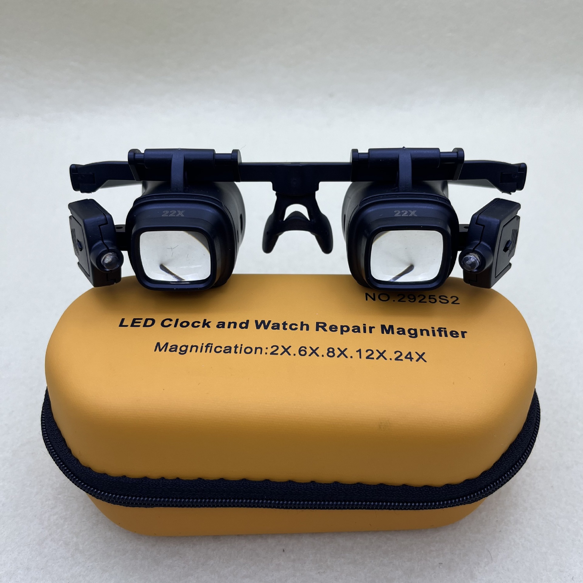 产品描述:ABS材质,亚克力镜片,镜片外形尺寸:29*25mm,该产品配有4 镜头(2X、6X、10X、22X),可更换不同倍数的镜片,可根据需求,选择倍数两侧LED灯可调整照明角度,镜筒座可自由翻转,鼻托架调节。