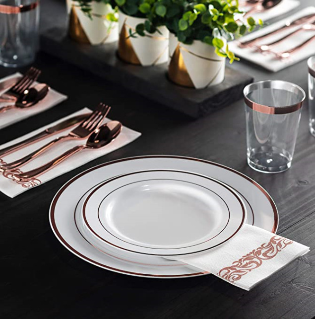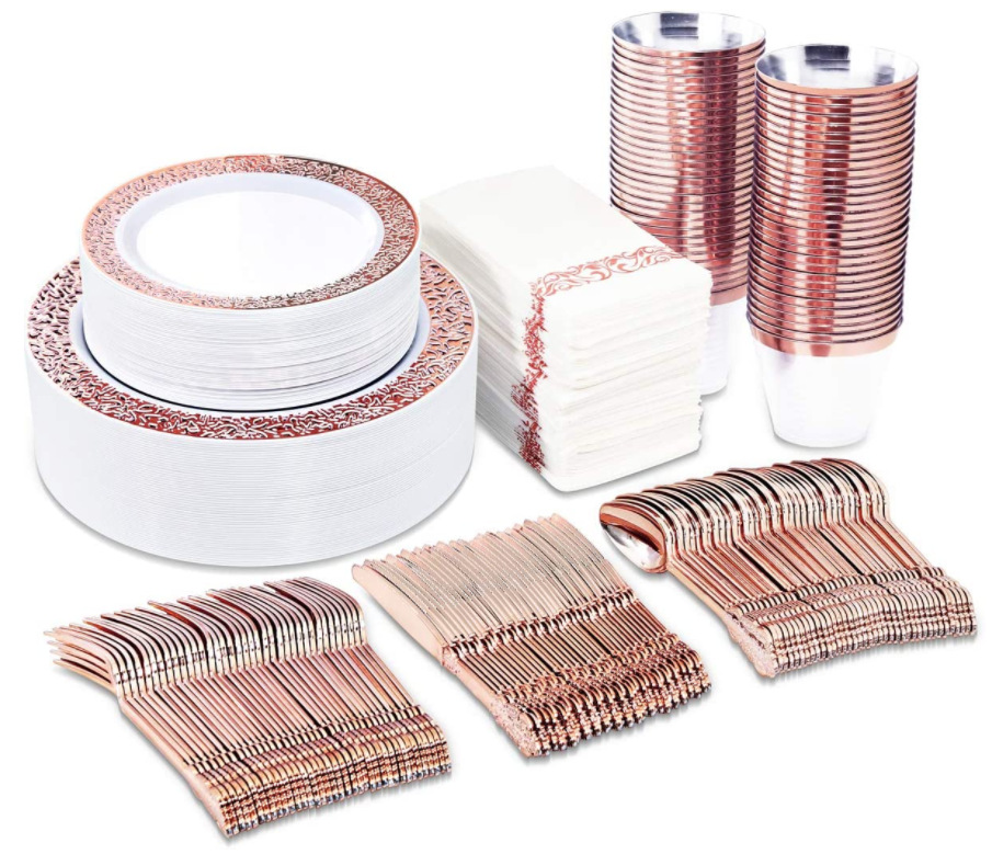 | 玫瑰金边大小盘+10OZ杯+12号刀叉勺+玫瑰金色纸巾各25个1套 | ¥0 | 988918套可售 |