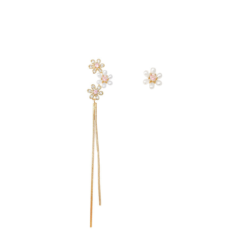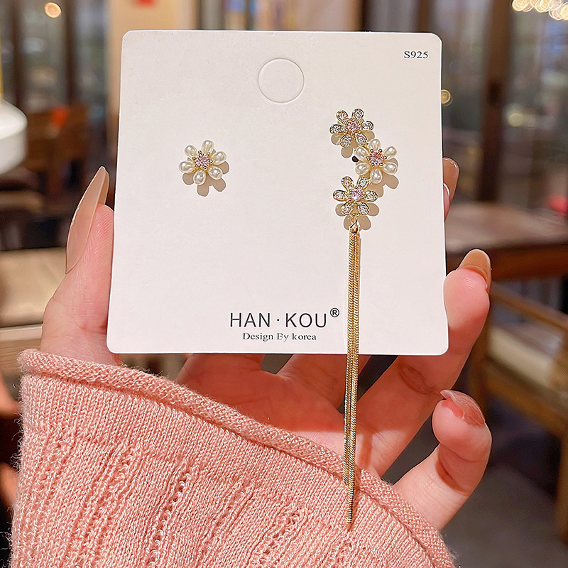 S925银针超仙气质不对称珍珠耳环女长款流苏满钻花朵耳钉耳饰批发
