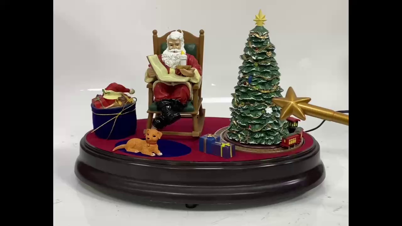 功能:射频识别控制,开机后火车转动伴随音乐,圣诞树亮灯光。魔法棒接触可控制圣诞树灯光,接触圣诞老公可控制其阅读及摇摆,接触小礼物包可控制火车转动,接触大礼物包可控制音乐。
