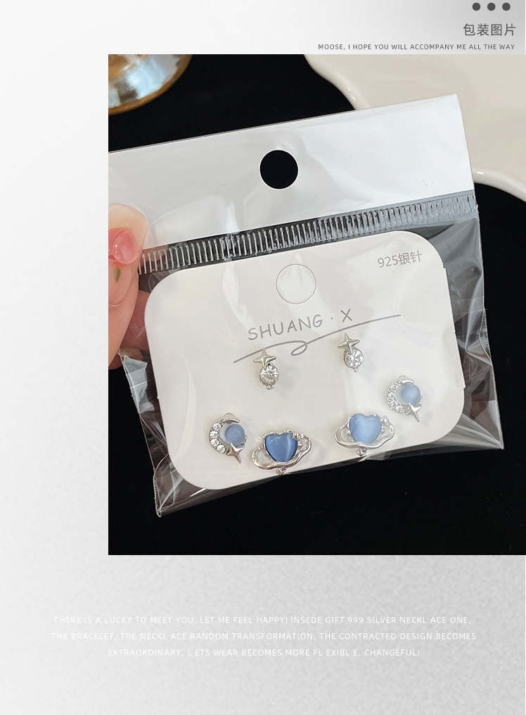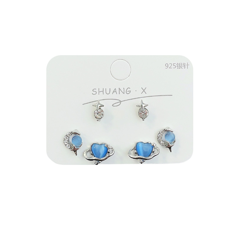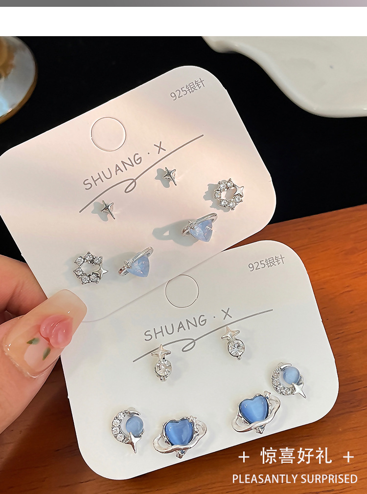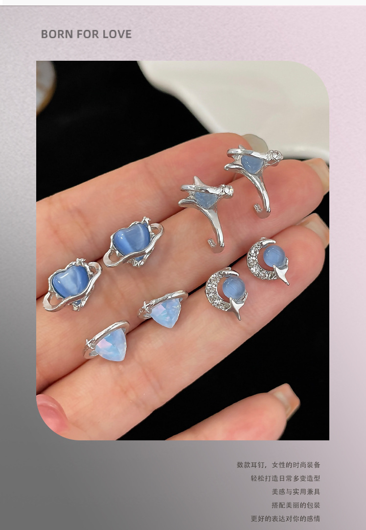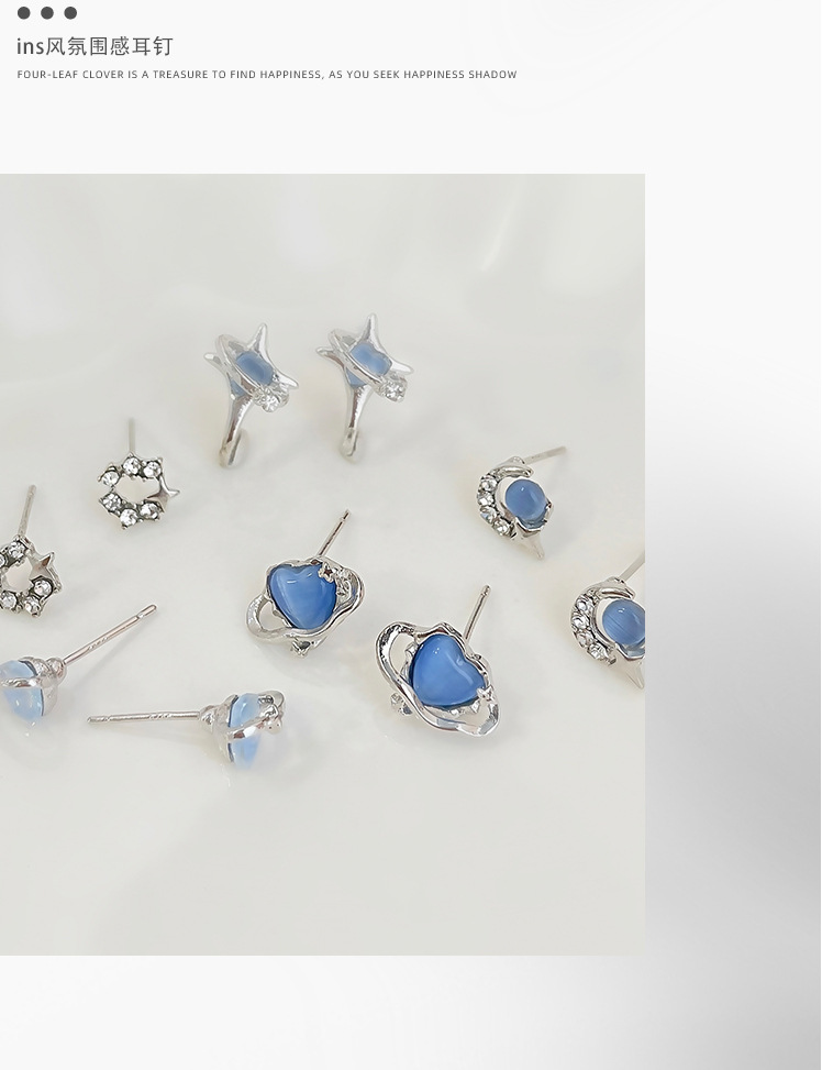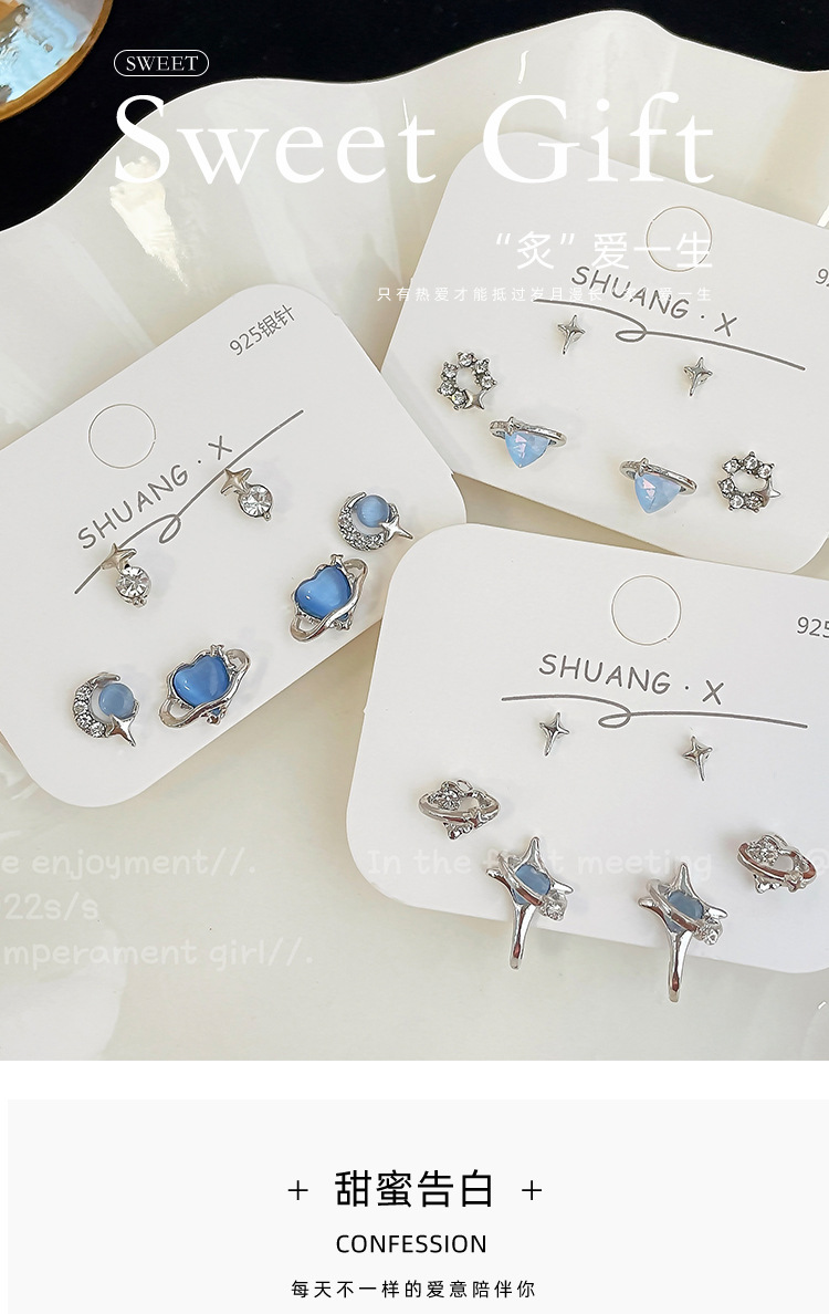 蓝色星空爱心猫眼石耳钉套装女冷淡风925银针小众设计感精致耳饰