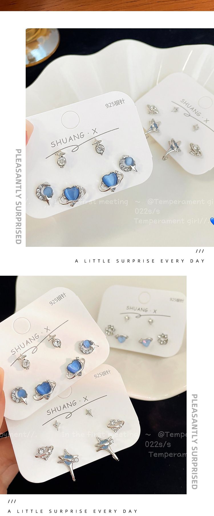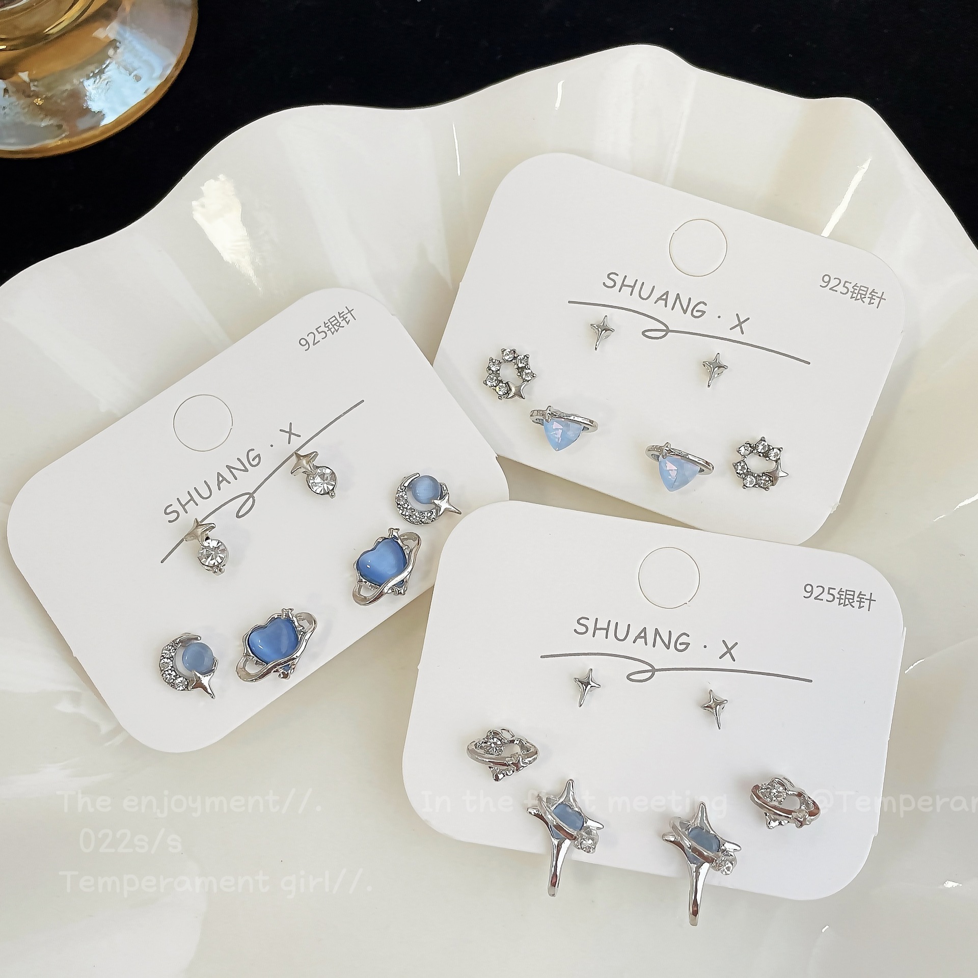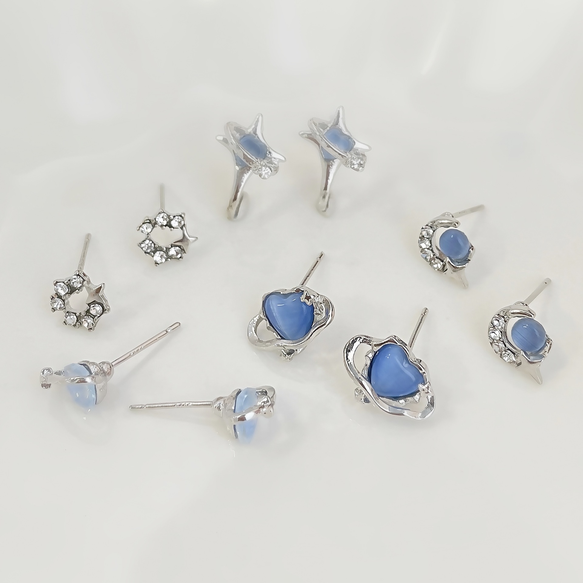蓝色星空爱心猫眼石耳钉套装女冷淡风925银针小众设计感精致耳饰