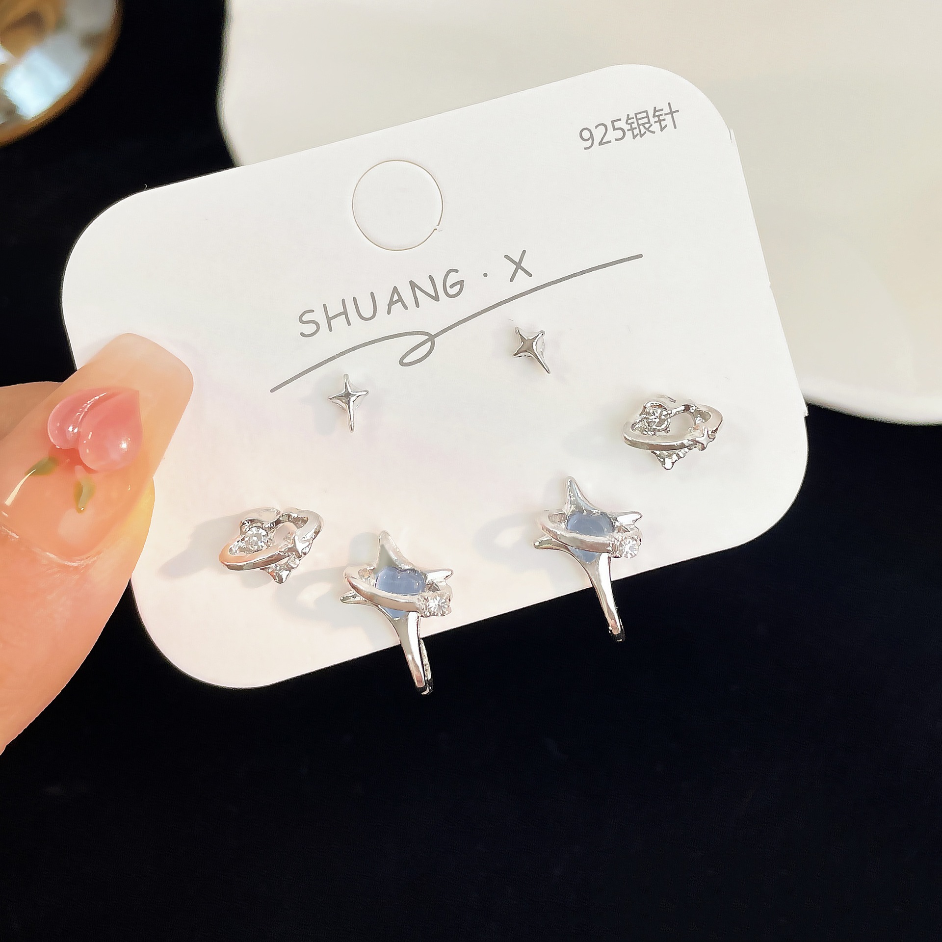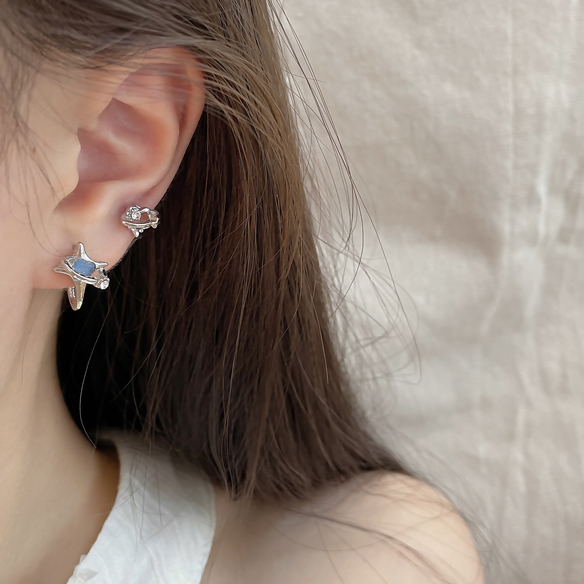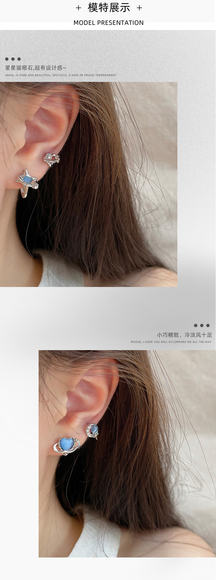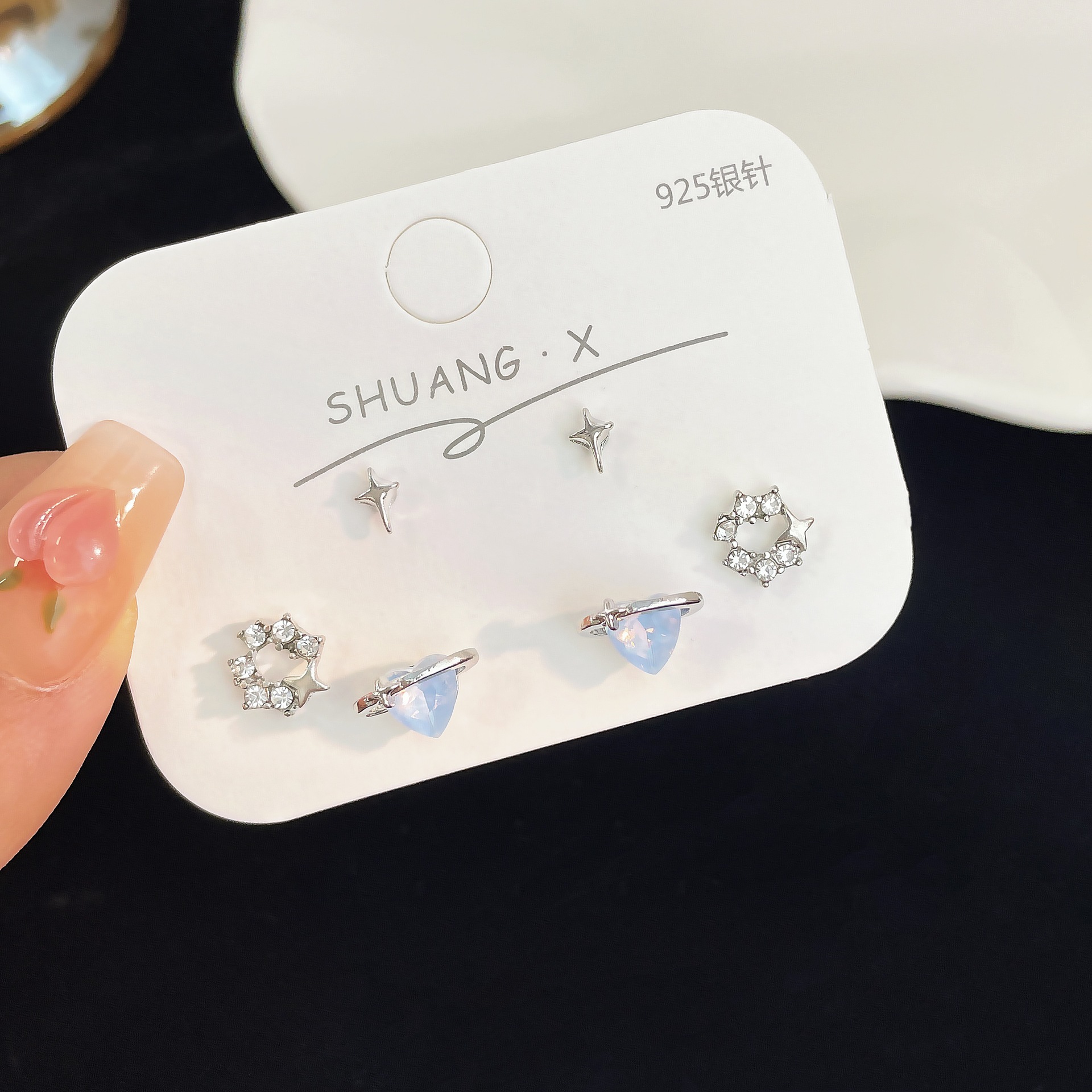 蓝色星空爱心猫眼石耳钉套装女冷淡风925银针小众设计感精致耳饰