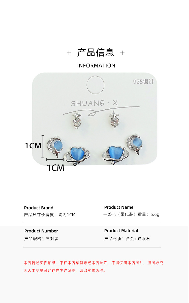 蓝色星空爱心猫眼石耳钉套装女冷淡风925银针小众设计感精致耳饰 投诉
