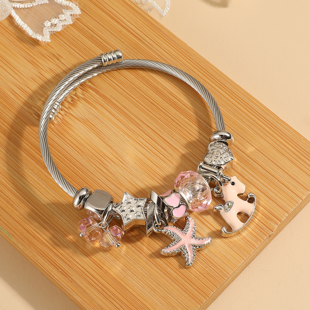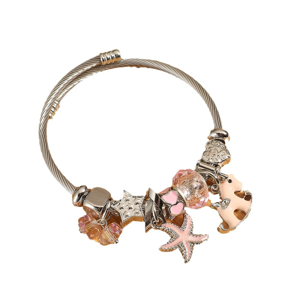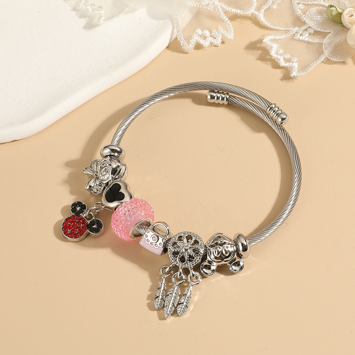 潘家不锈钢卡通手链女士儿童串珠手镯可调节大小送礼粉色系列批发