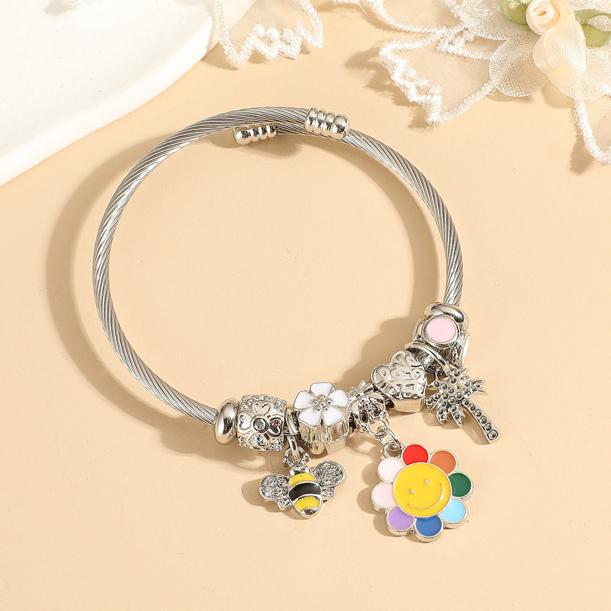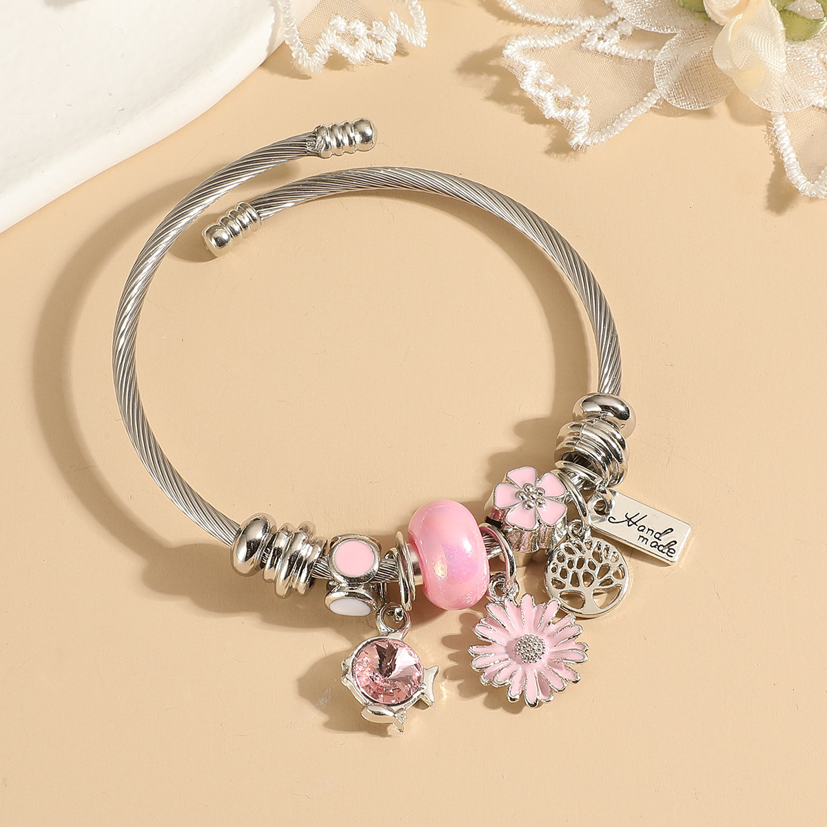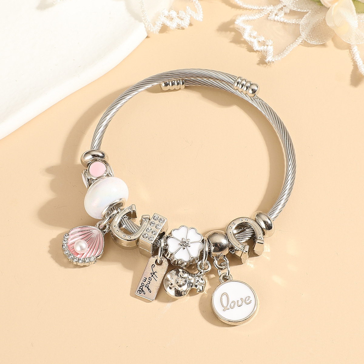 潘家不锈钢卡通手链女士儿童串珠手镯可调节大小送礼粉色系列批发