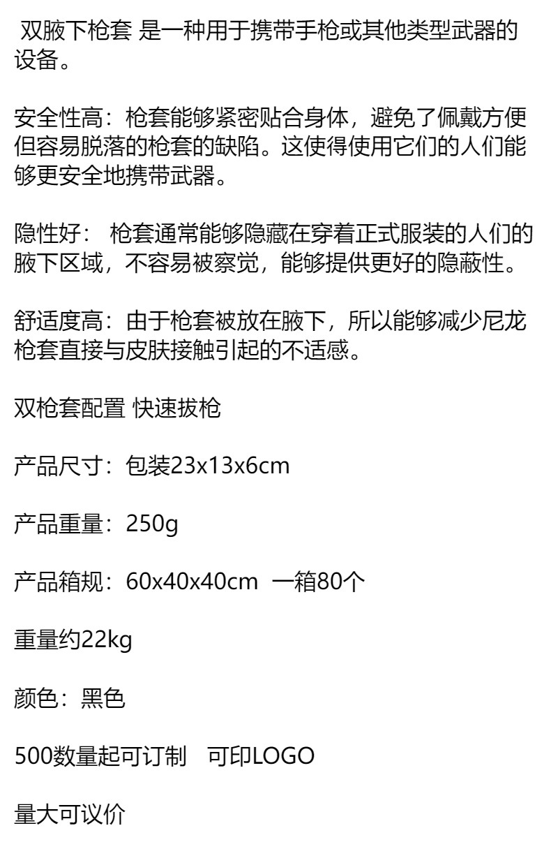 户外战术便携式双肩腋下隐藏双枪枪套 特工快拔隐形枪套 大量现货 投诉