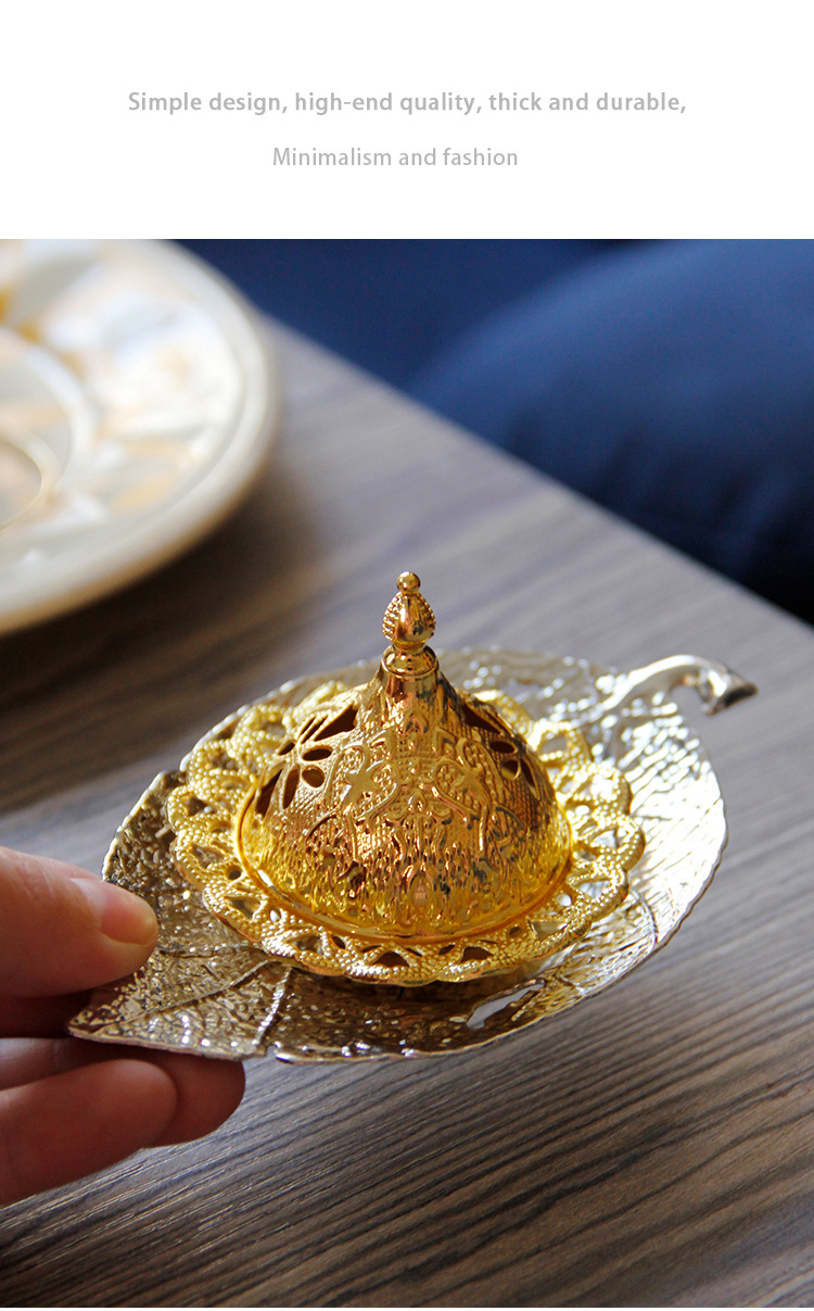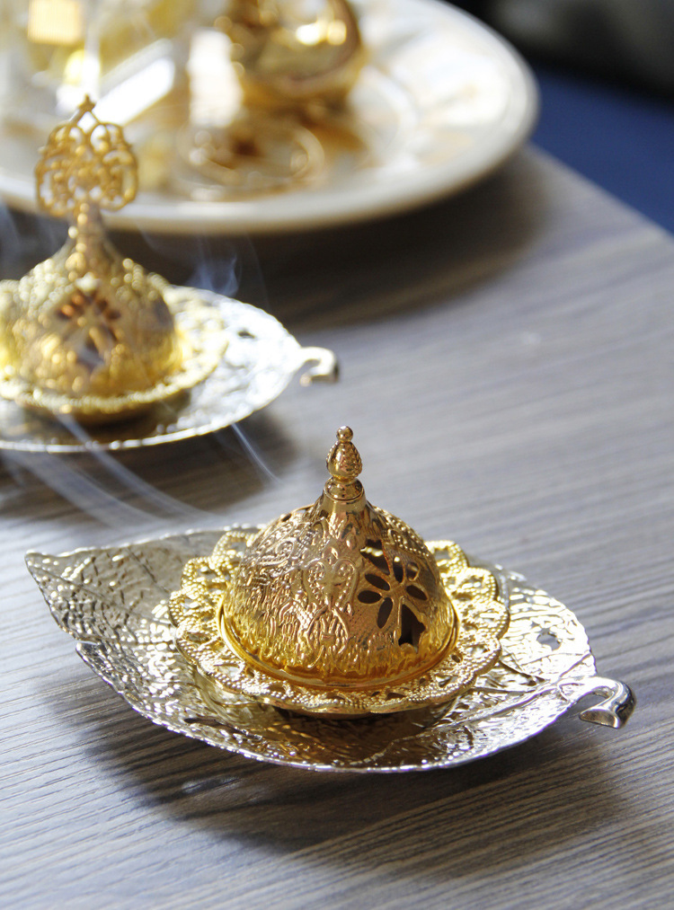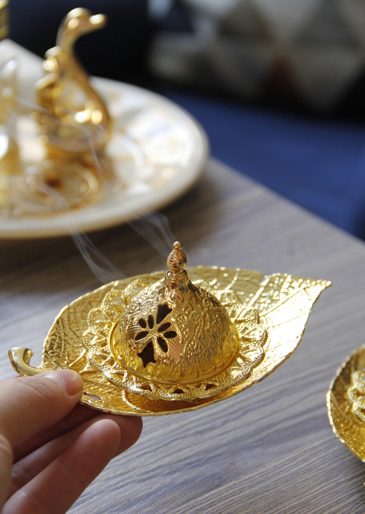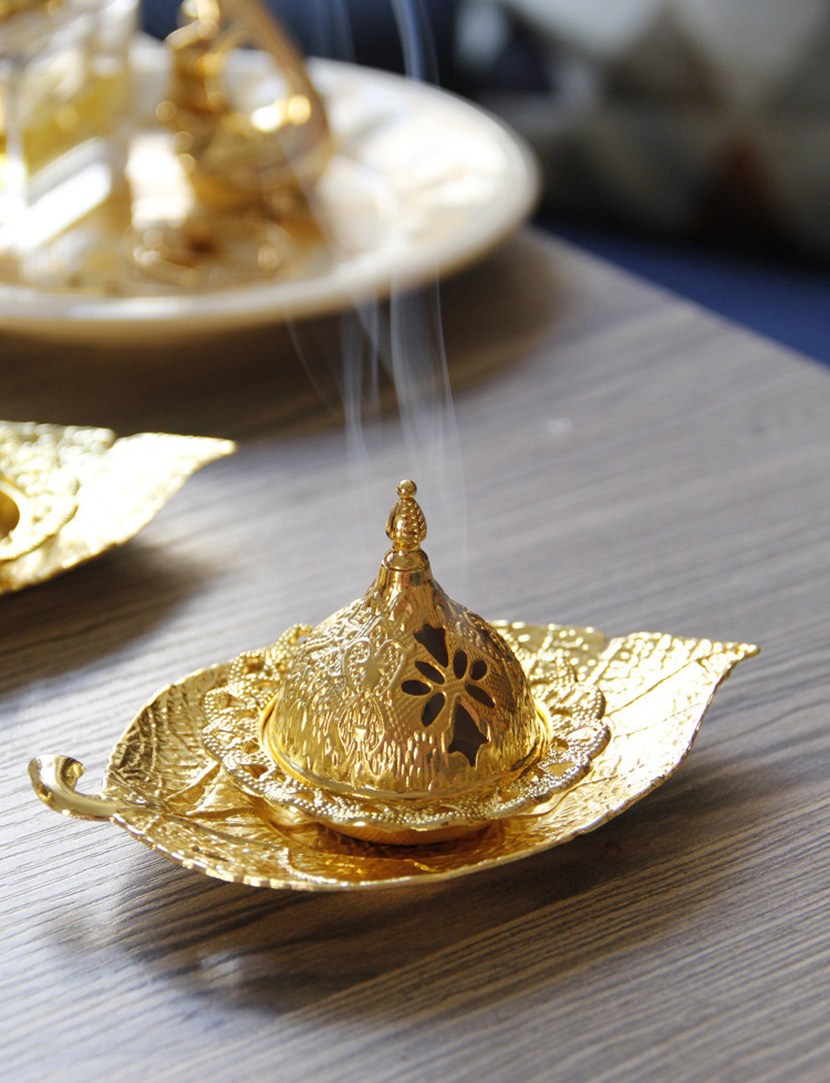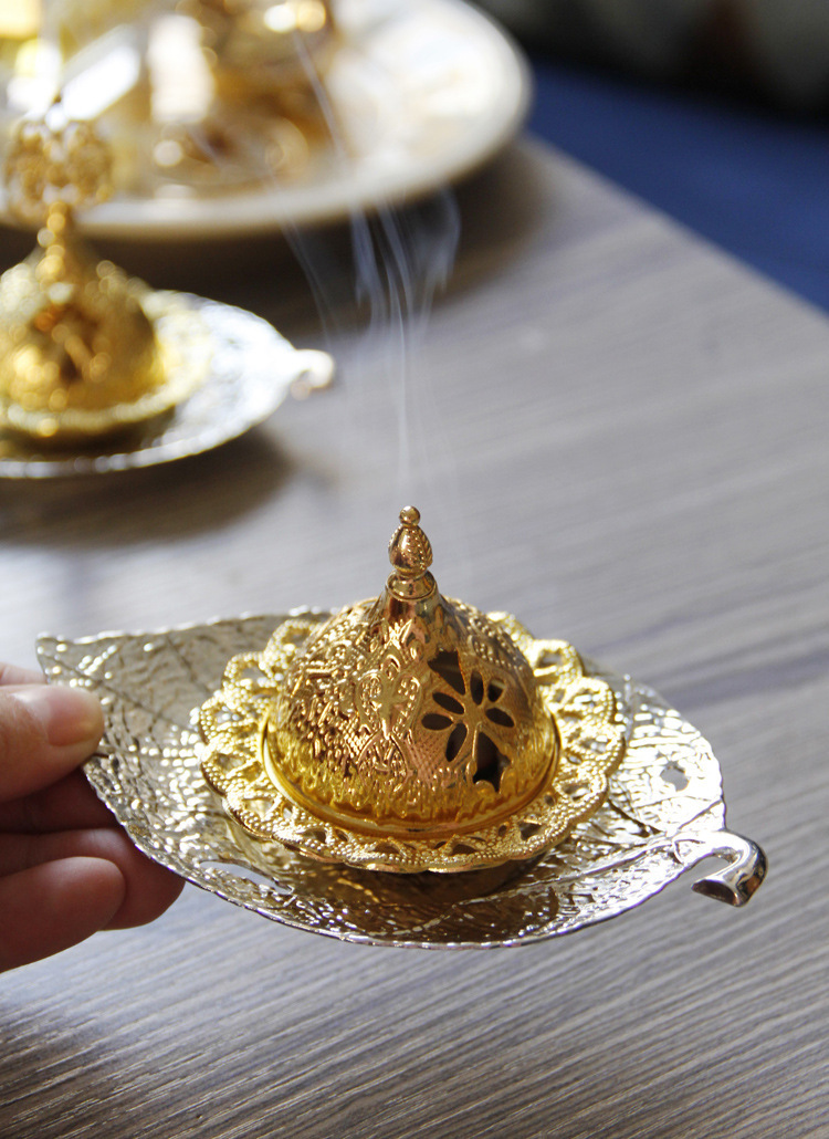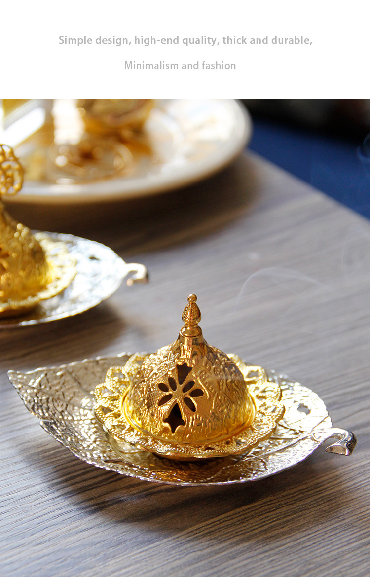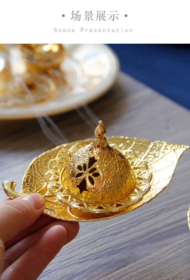 中东阿拉伯手持香炉金色叶子托盘杯垫加金色塔顶香炉家居摆件 English | 投诉