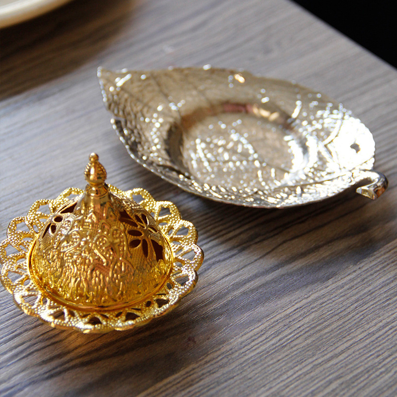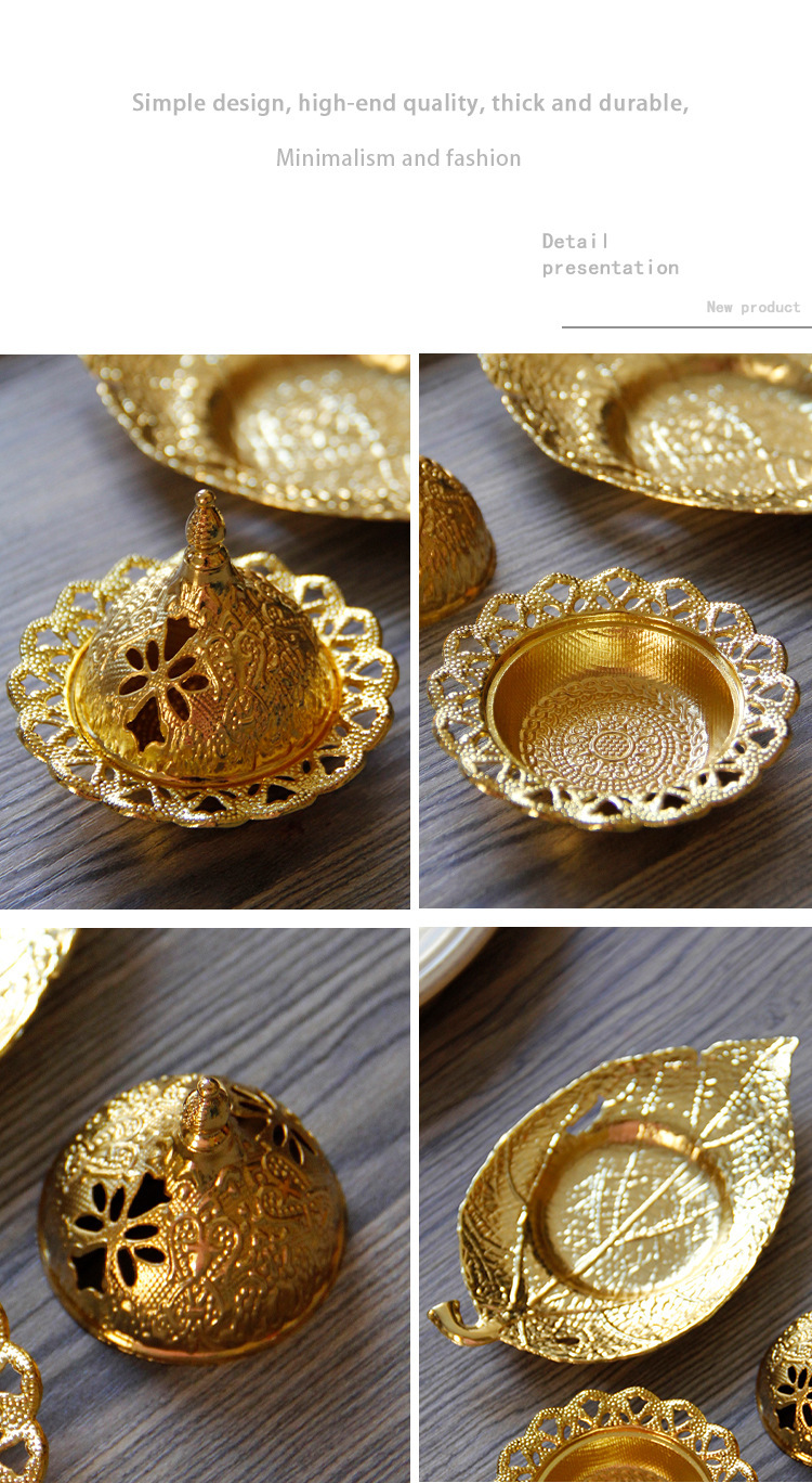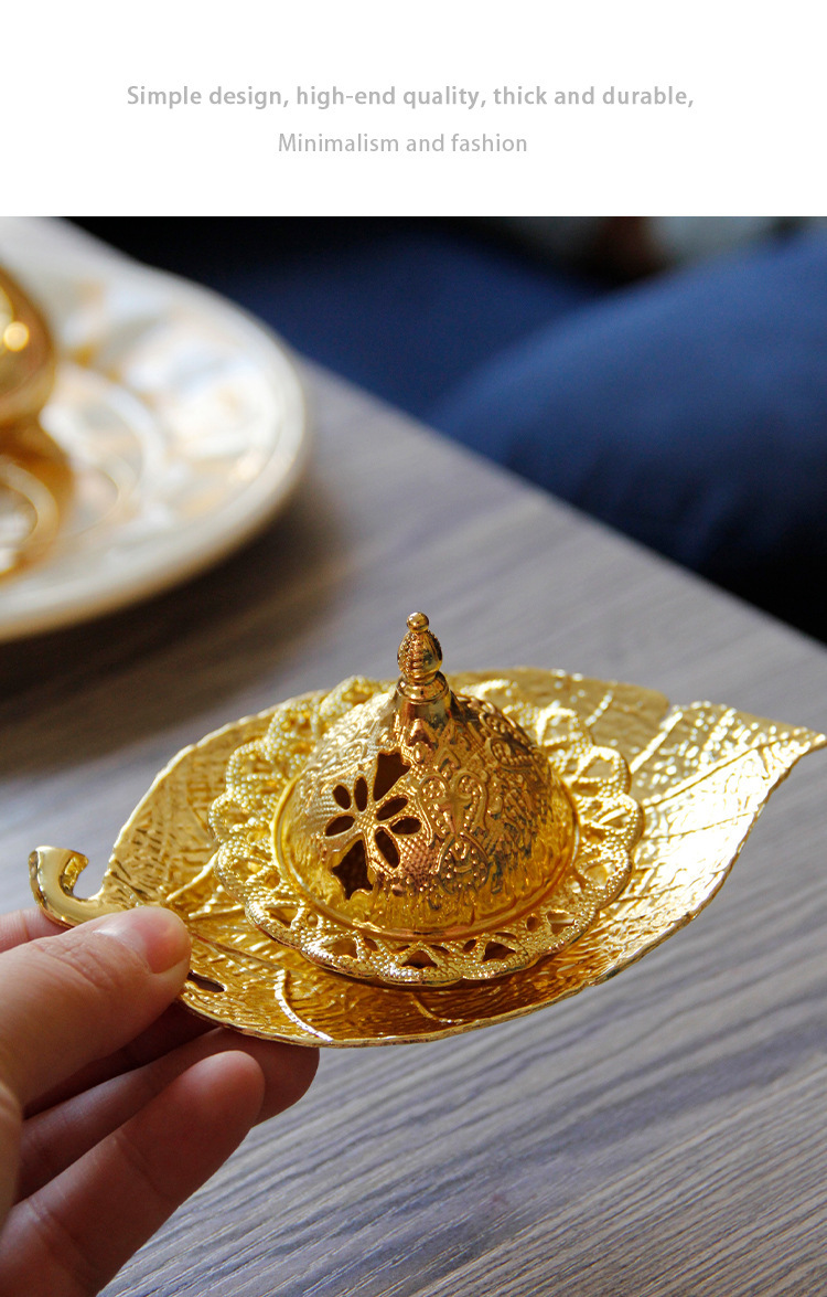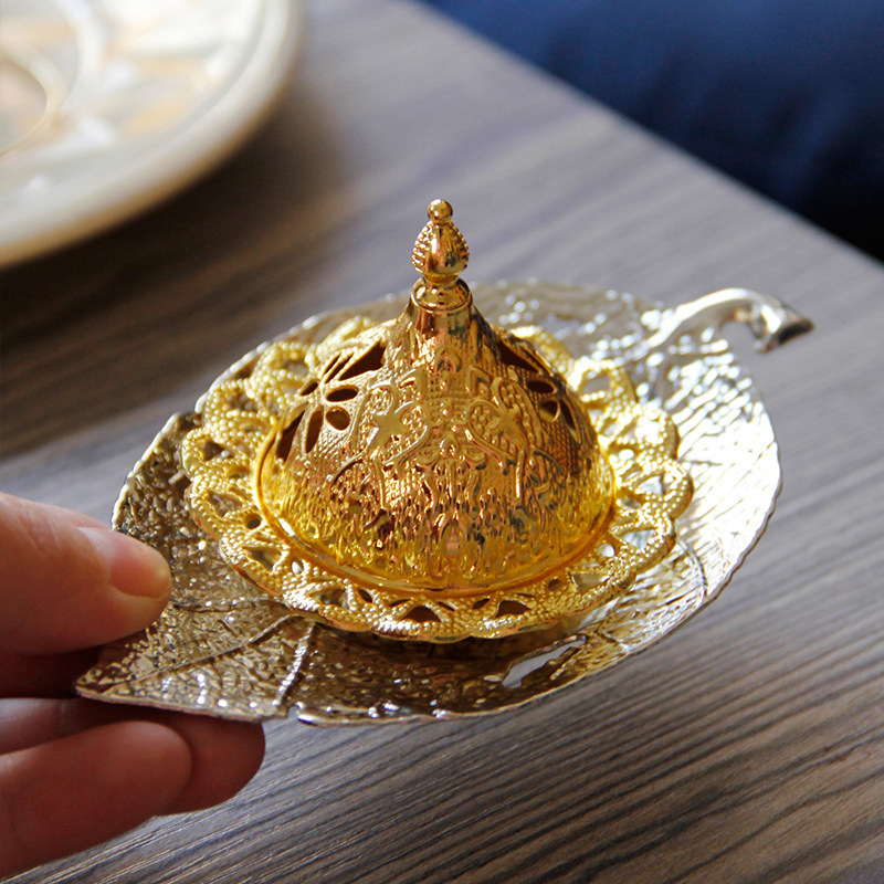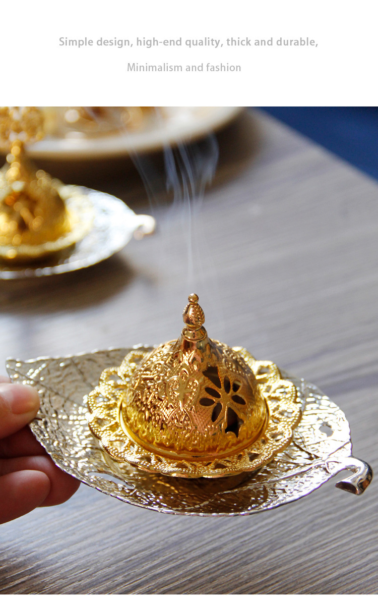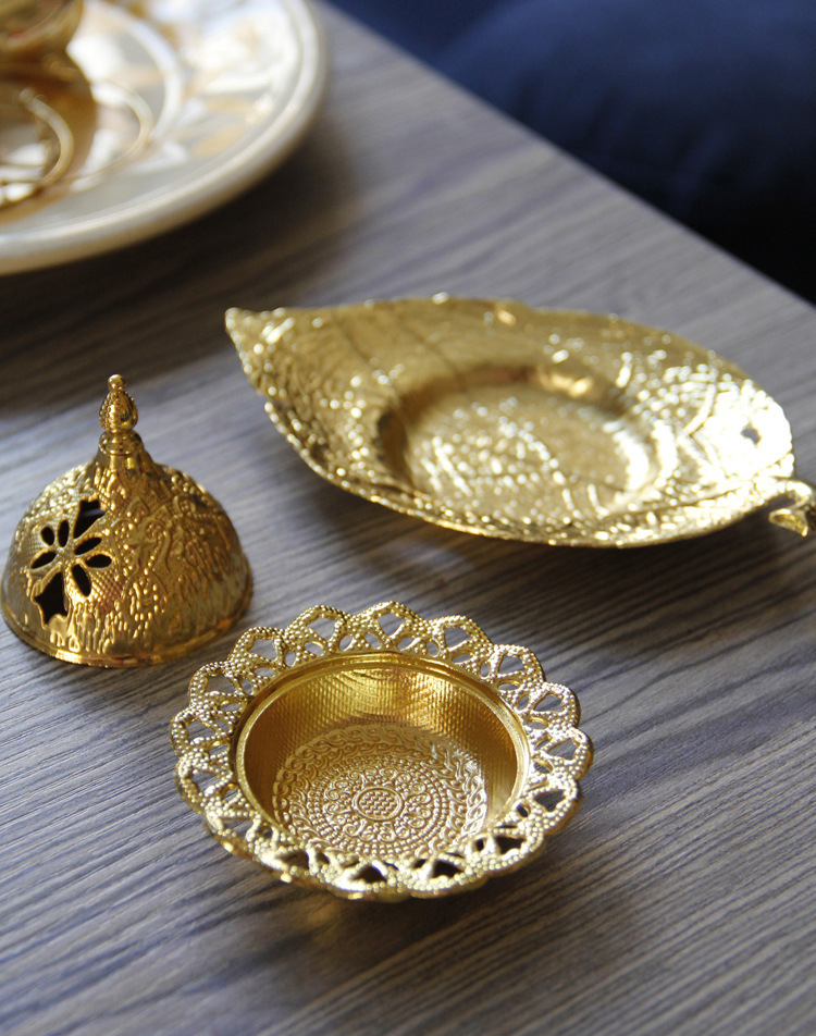 中东阿拉伯手持香炉金色叶子托盘杯垫加金色塔顶香炉家居摆件 English | 投诉