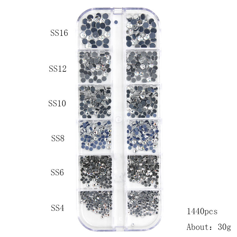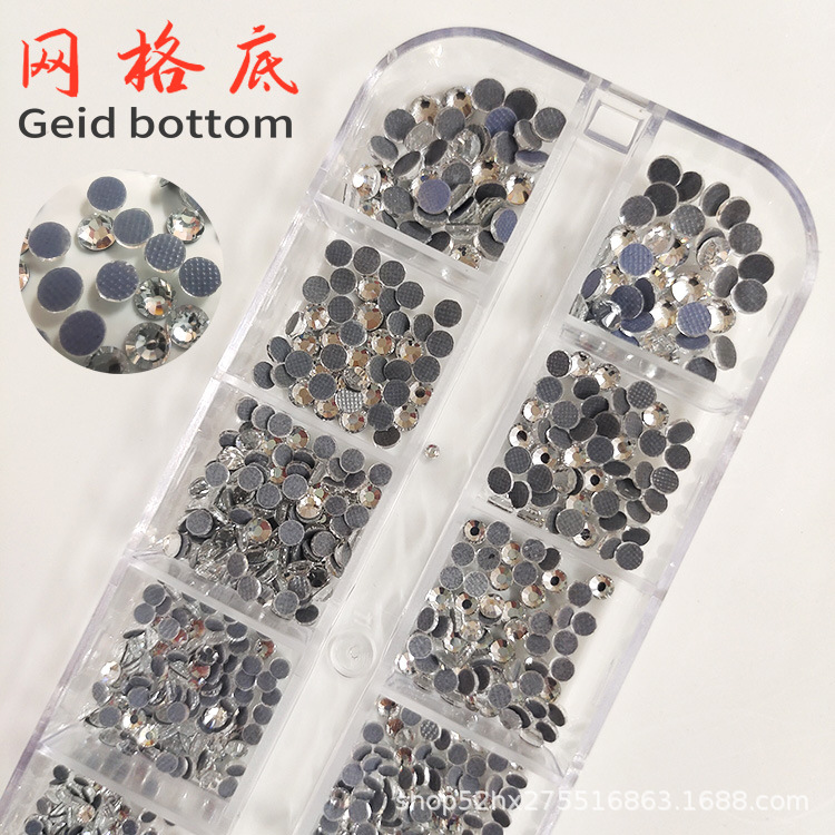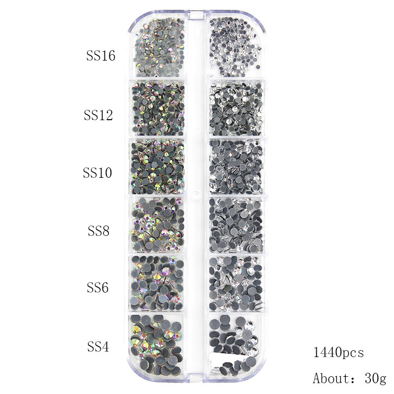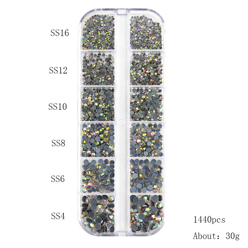 跨境平底钻美甲饰品套装网格底烫钻平底钻AB幻彩圆形水钻长条盒装