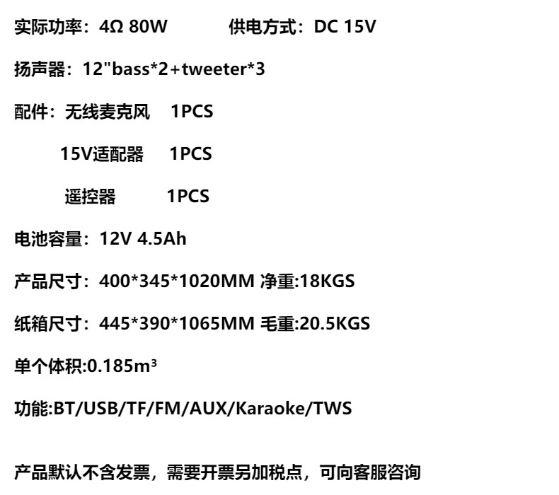 品牌: 韩索 适用场景: 桌面,健身运动,户外,居家,移动便携,K 上市时间: 2023 连接方式: 蓝牙连接 频响范围: 60Hz-15KHz 信噪比: ≥95dB 喇叭数: 2 有效距离: 20米 箱体材质: 塑料 外观尺寸: 移动户外无线蓝牙七彩灯音箱 广场舞手提便