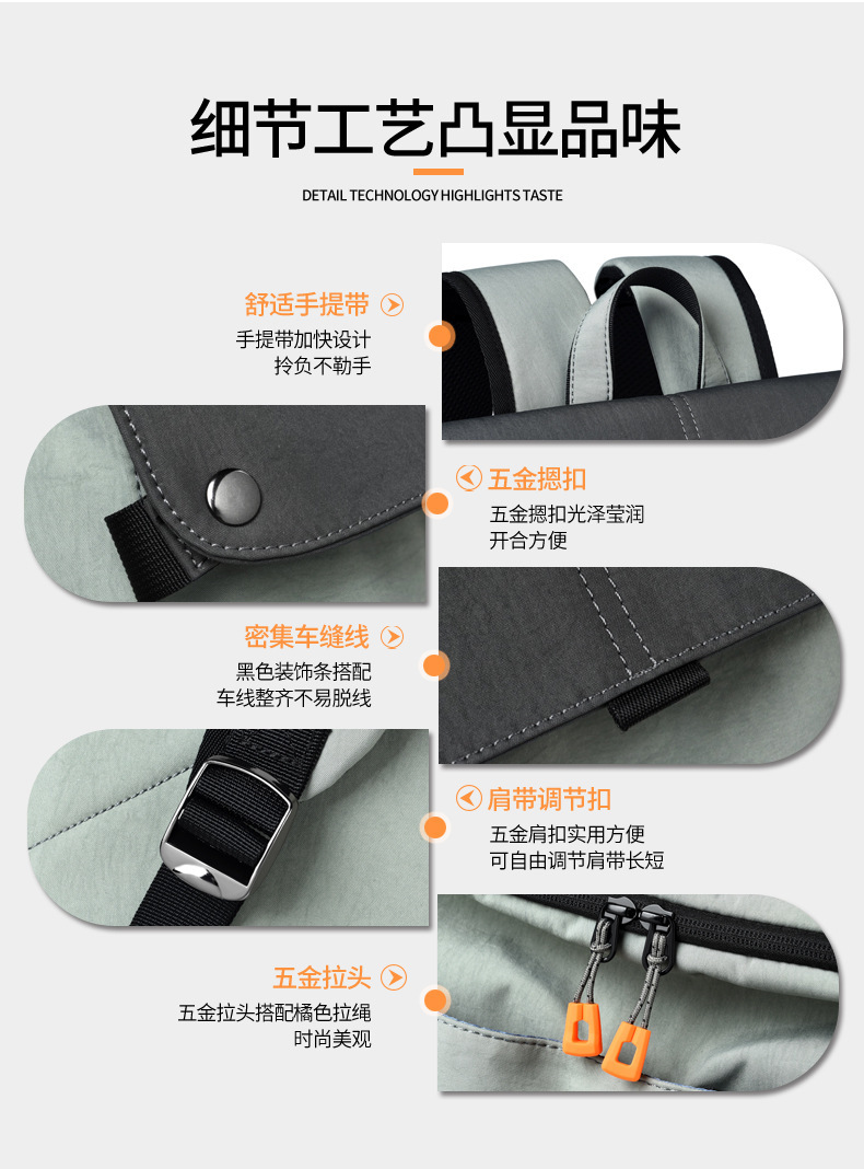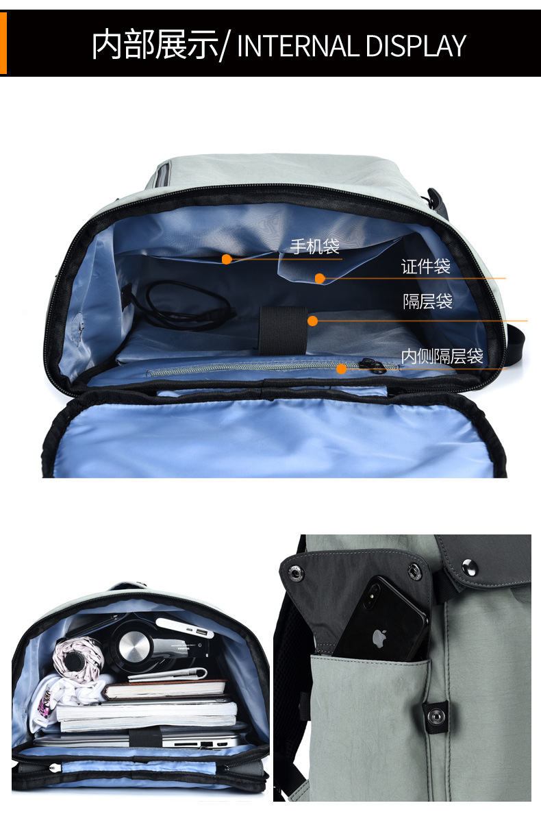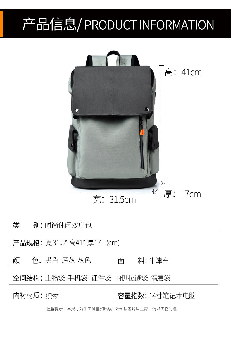 颜色: 灰色,黑色,深灰 适用性别: 中性/男女均可 适用场景: 休闲旅行 材质: 牛津布 风格: 都市简约 品牌: 其他 皮质特征: 无 容量: 20-35L 功能: 减负 容纳电脑尺寸: 16英寸 重量: 0.7 kg/个