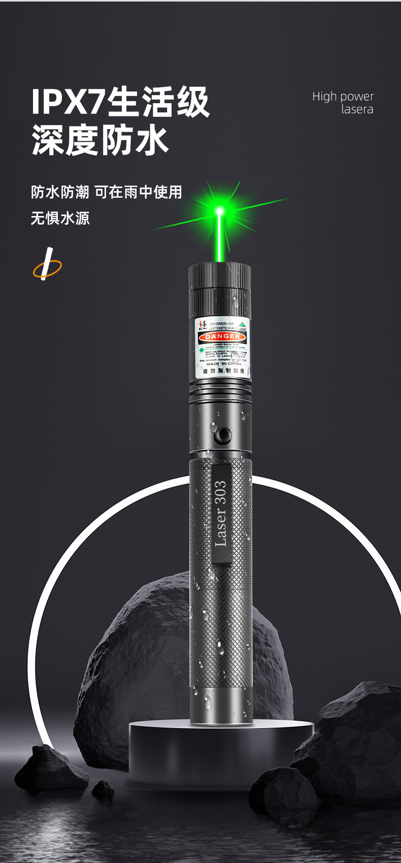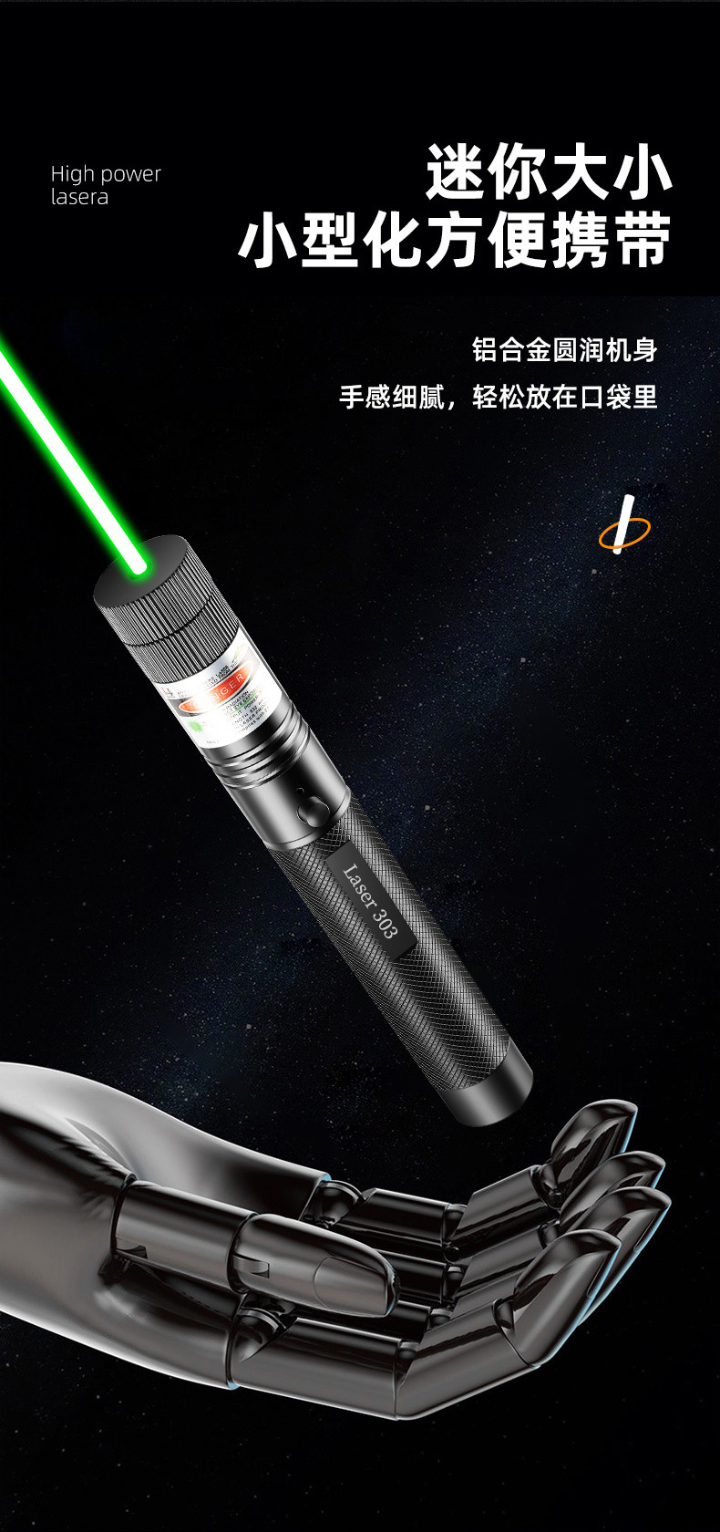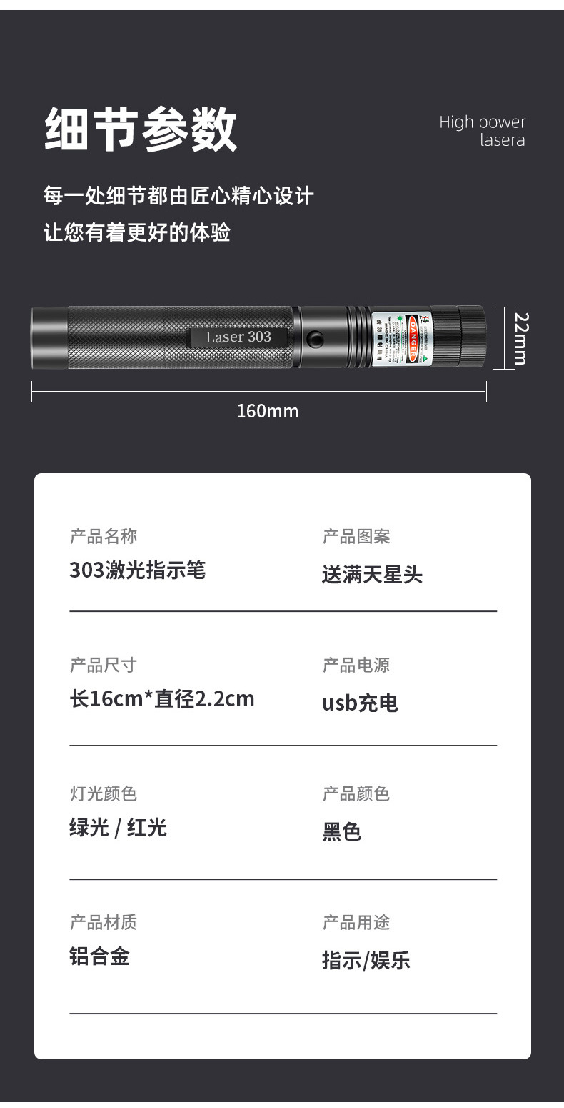 品牌: 众横 型号: 303USB款【数据线+可拆卸满天星】, 尺寸: 16.2*2.2cm 产地: 浙江义乌 激光距离: 3900m 激光波长: 523nm 电池: 内置18650锂电池 主要下游平台: ebay,亚马逊,wish,速卖通,独立 主要销售地区: 欧洲,东南亚,中东,其他 有可授权的自有品牌: 否