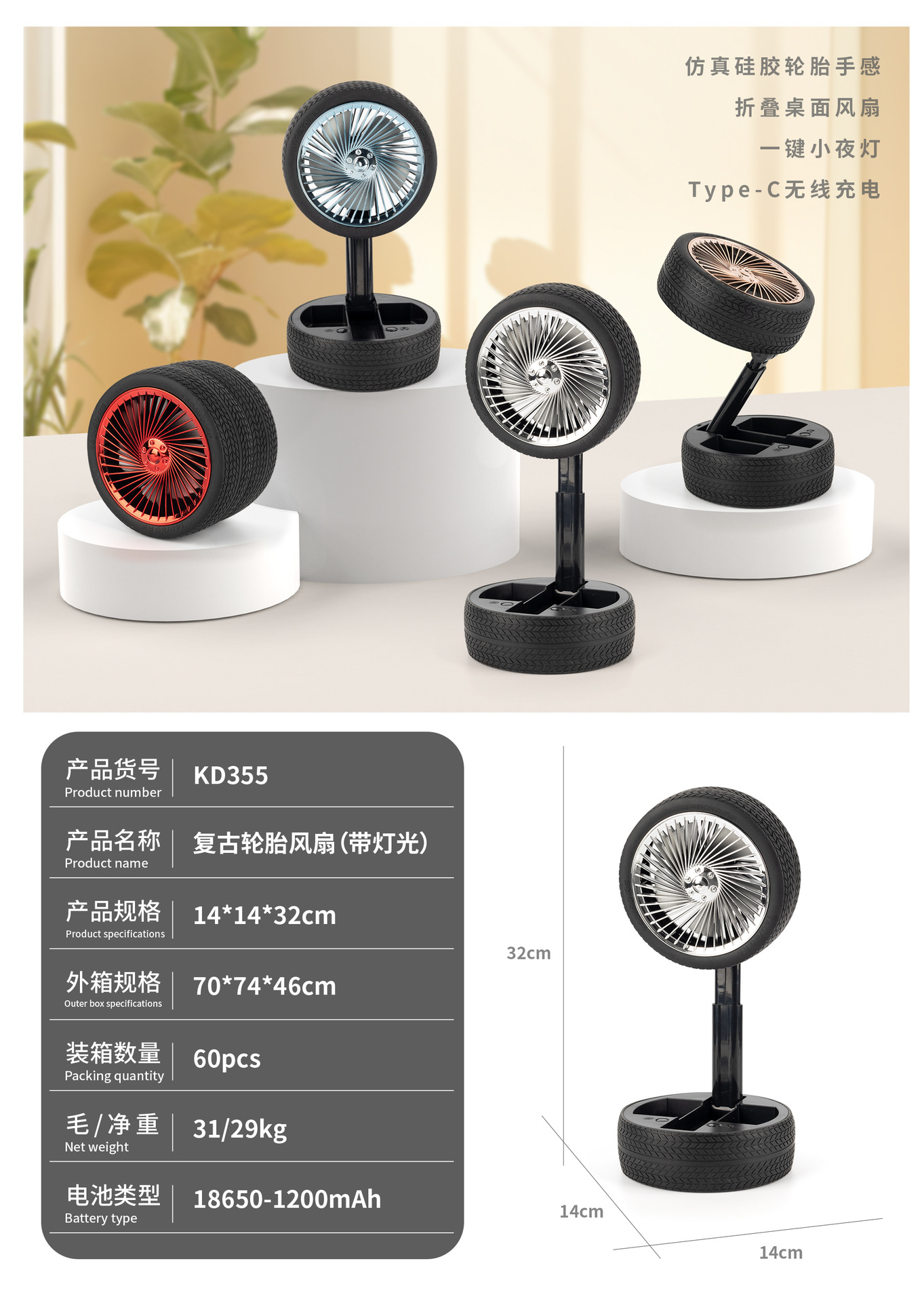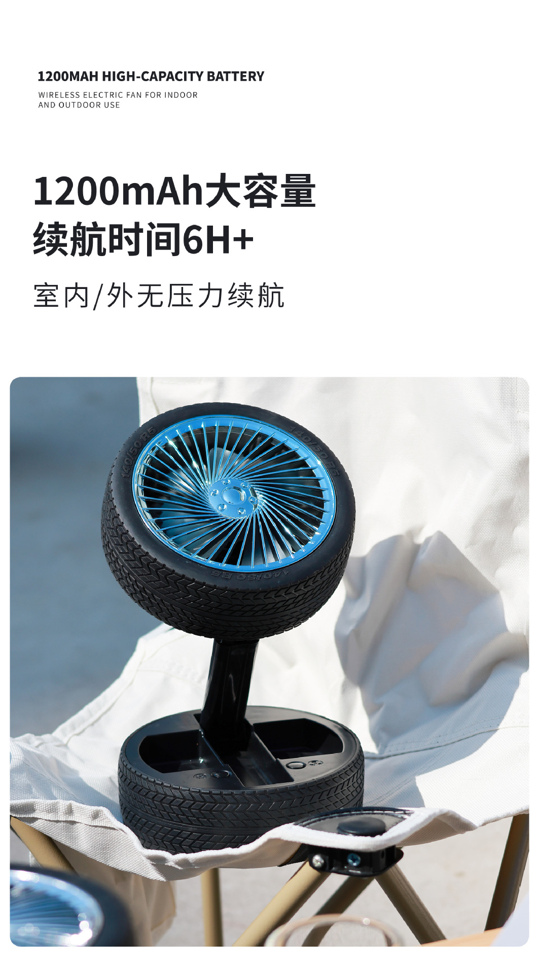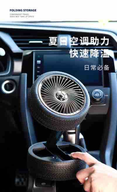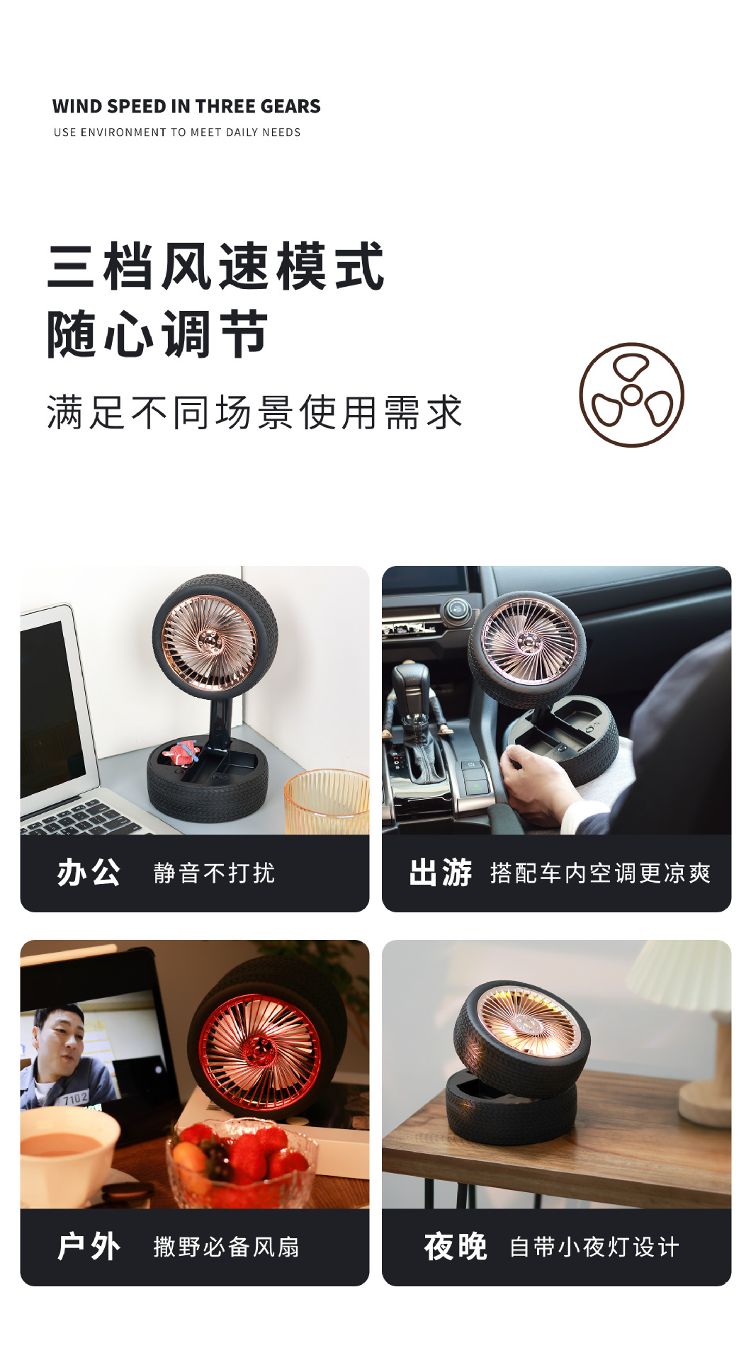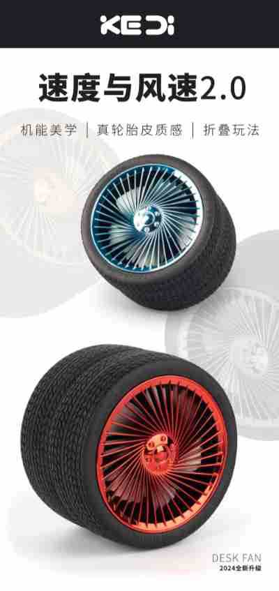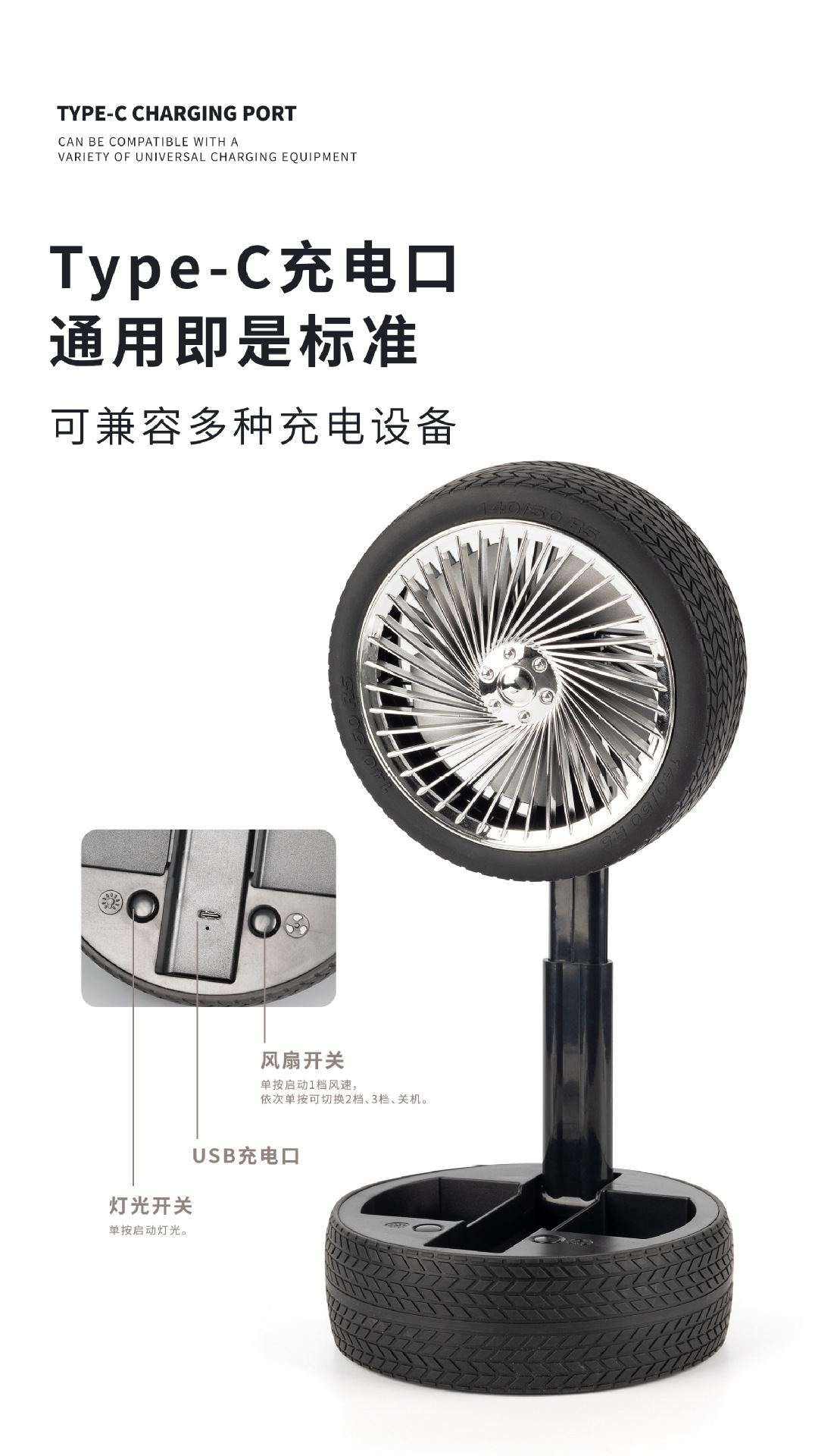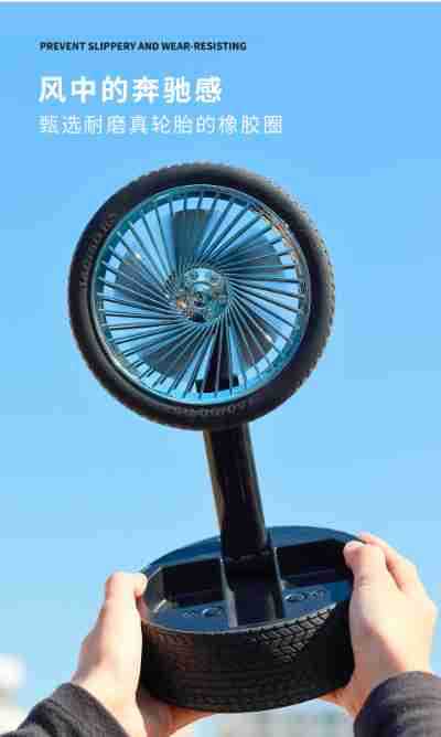 轮胎折叠小风扇便携台式充电带灯光户外露营迷你电风扇三档大风力 English | 投诉
