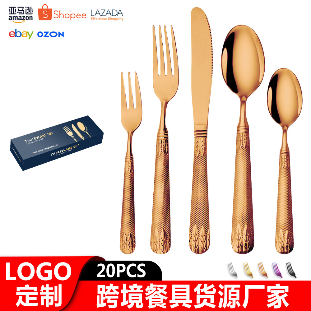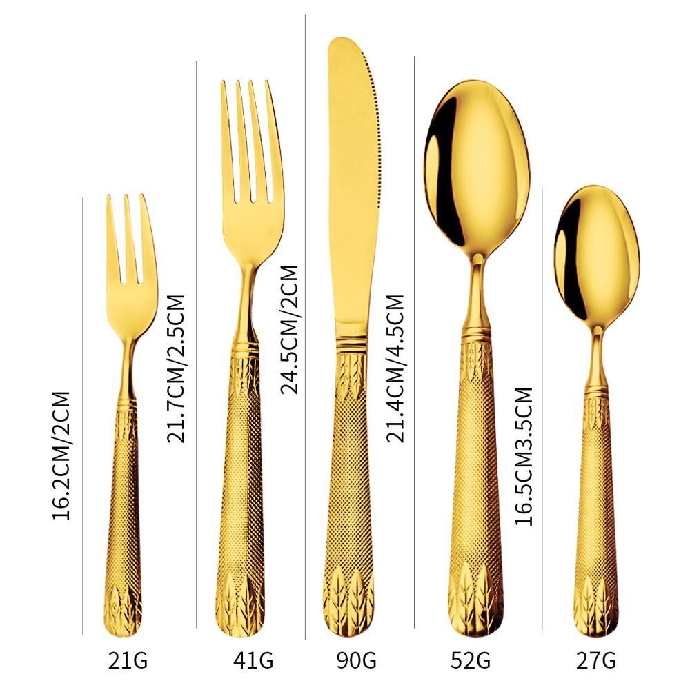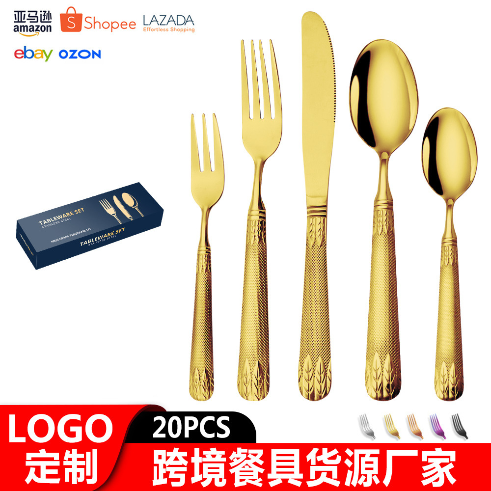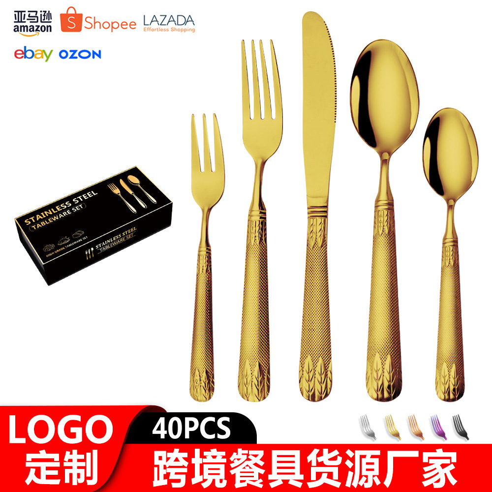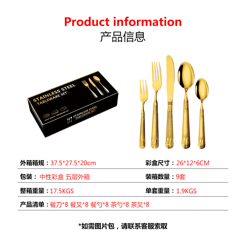 亚马逊不锈钢餐具套装刀叉勺跨境新款麦穗镀金色西餐牛排刀叉勺子