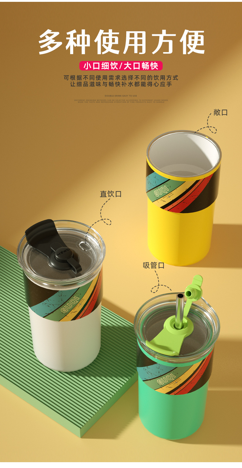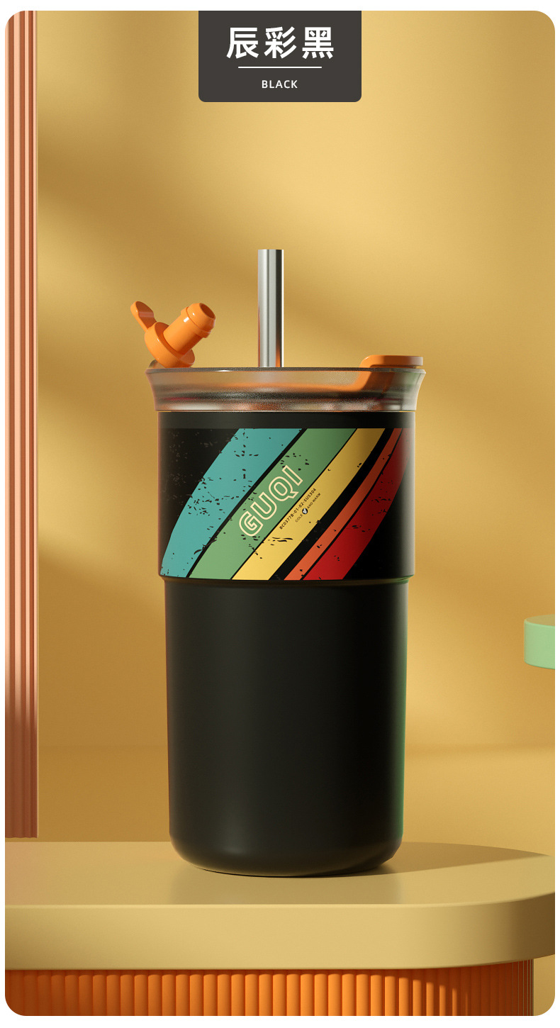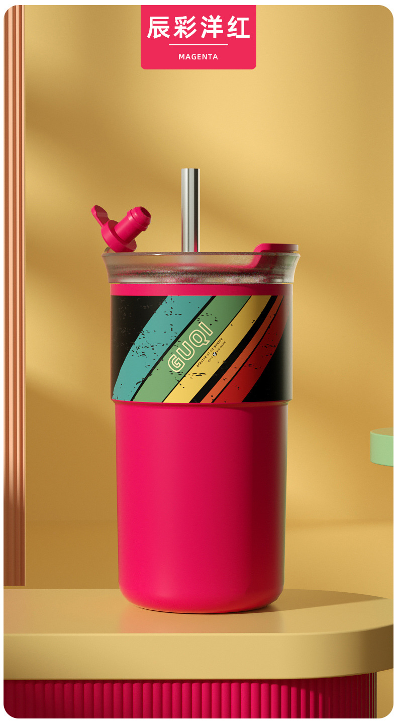 夏季新款陶瓷咖啡杯内外304不锈钢男女生高颜值随手水杯带吸管