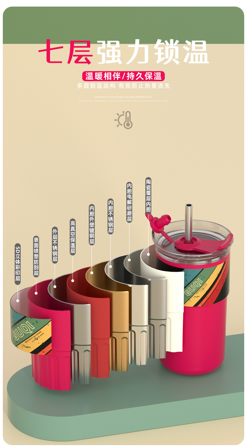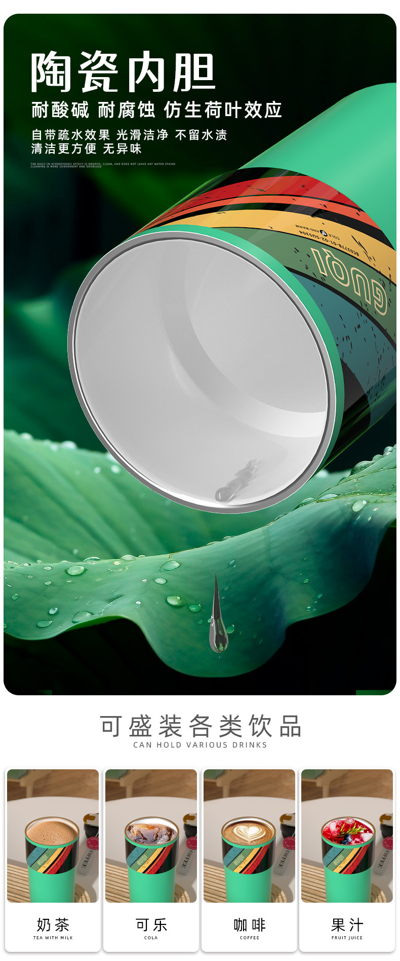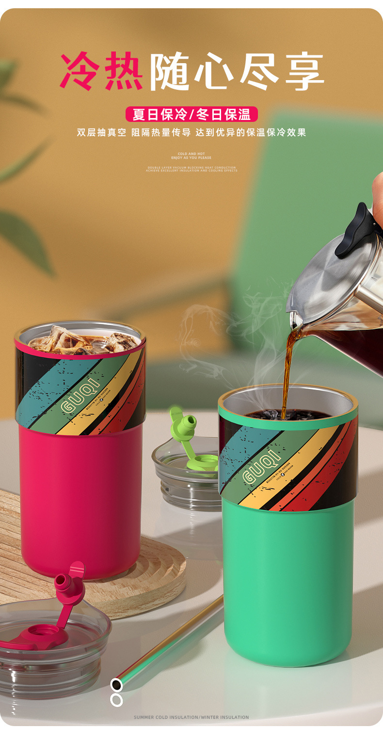 夏季新款陶瓷咖啡杯内外304不锈钢男女生高颜值随手水杯带吸管
